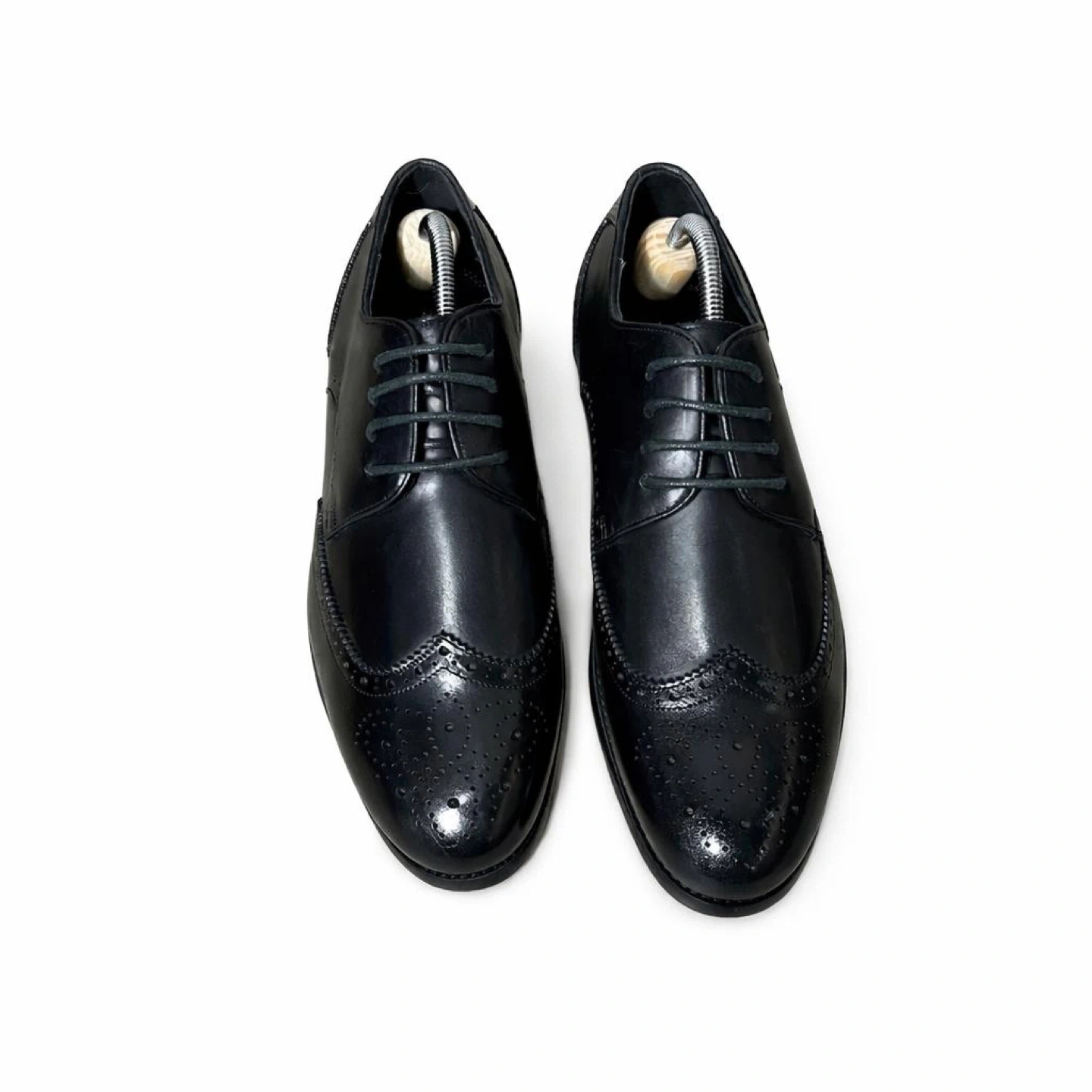 Classic black leather wingtip oxford dress shoes. Leather uppers and soles. Lace-up closure. Wingtip brogue detailing.
