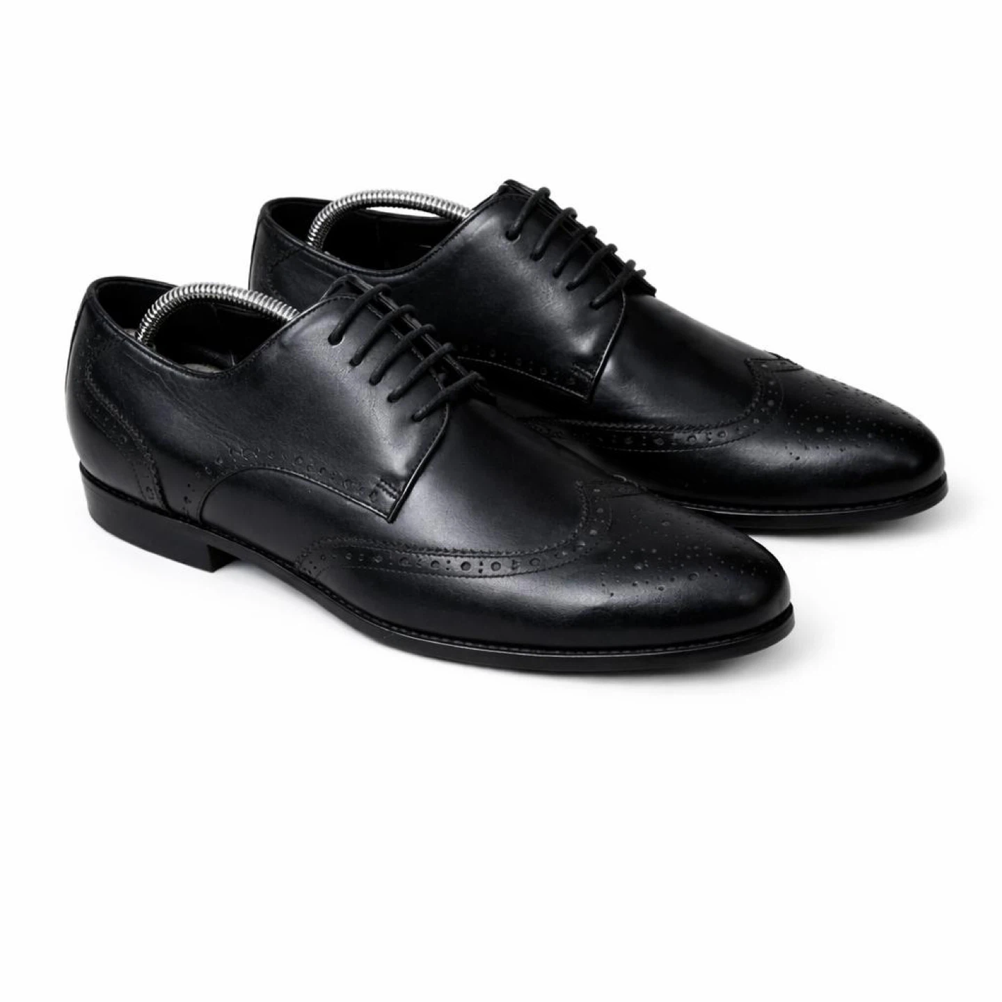 Classic black leather wingtip oxford dress shoes. Leather uppers and soles. Lace-up closure. Wingtip brogue detailing.