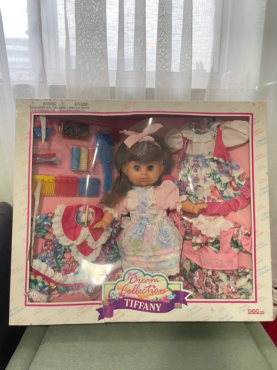 Vintage doll playset. Includes doll, multiple outfits, hairbrush, and accessories. Great for collectors or children.