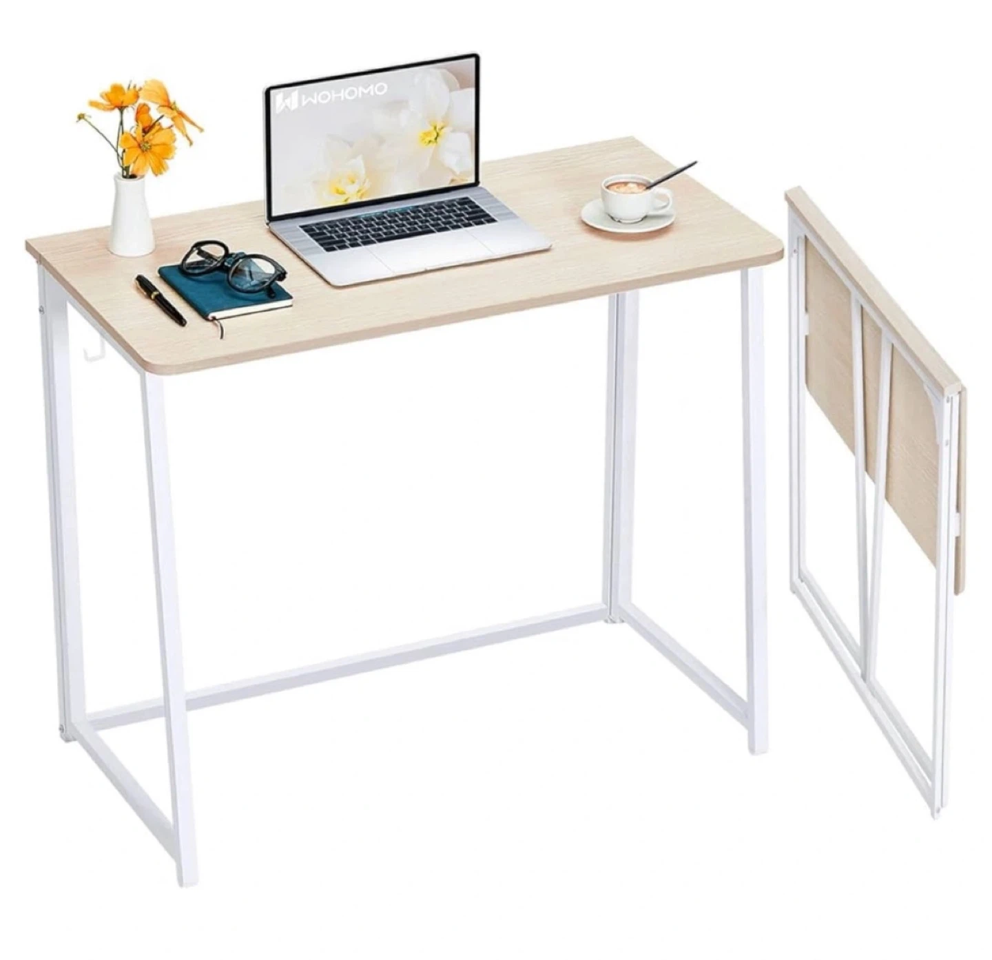 This is a folding desk. It features a light wood-grain top with a white metal frame. It's foldable for easy storage and portability! This desk is a great option for small spaces.