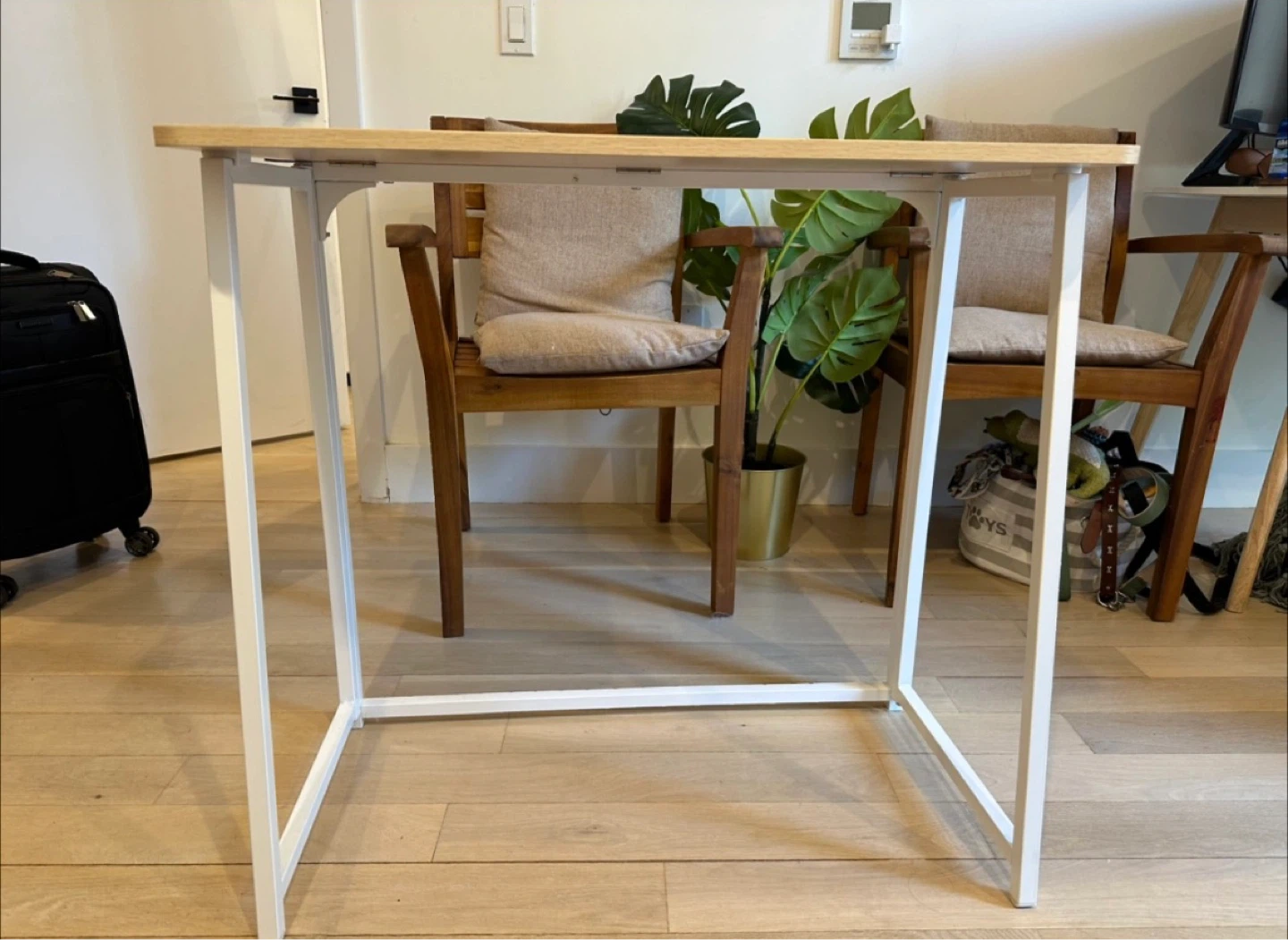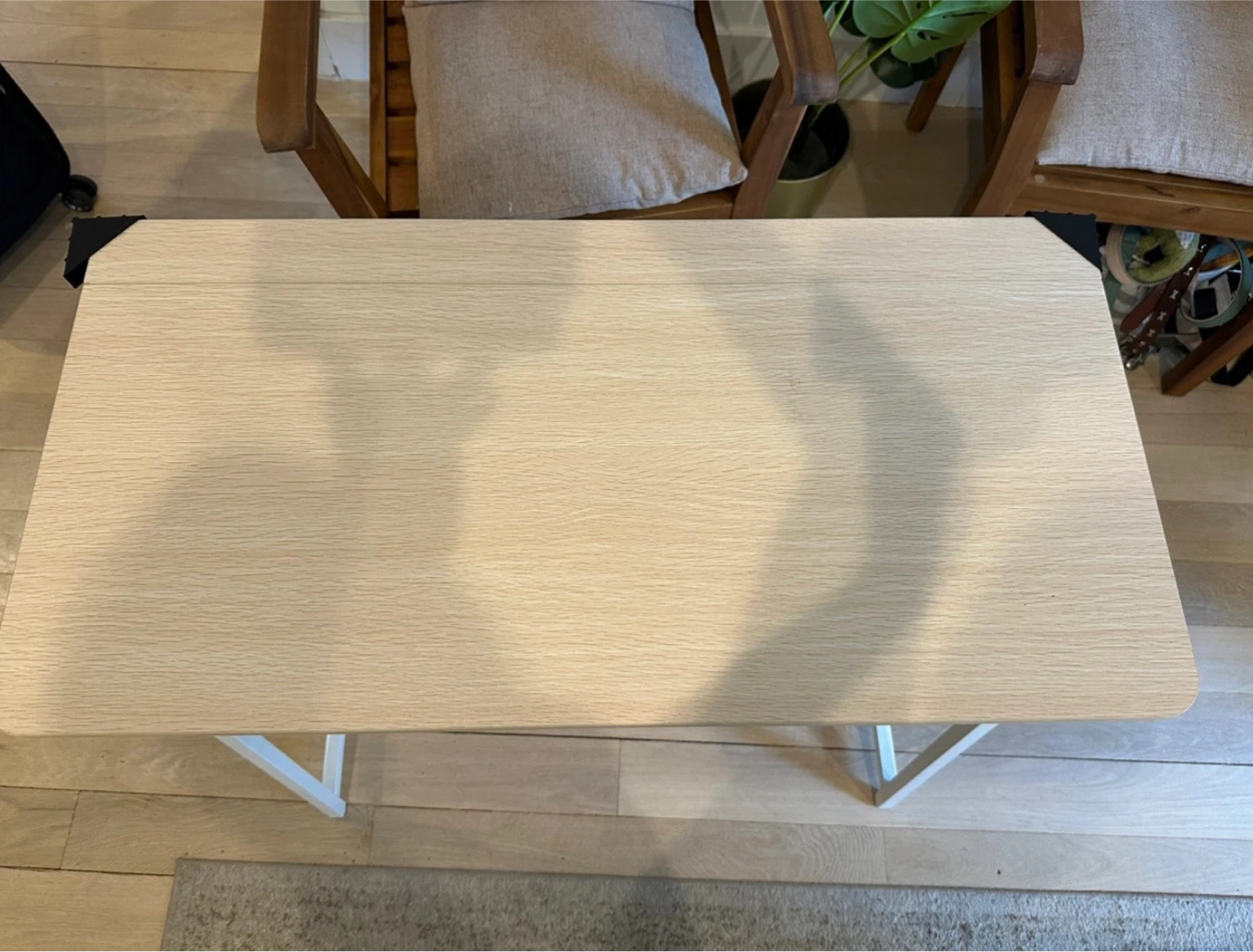 This is a folding desk. It features a light wood-grain top with a white metal frame. It's foldable for easy storage and portability! This desk is a great option for small spaces.