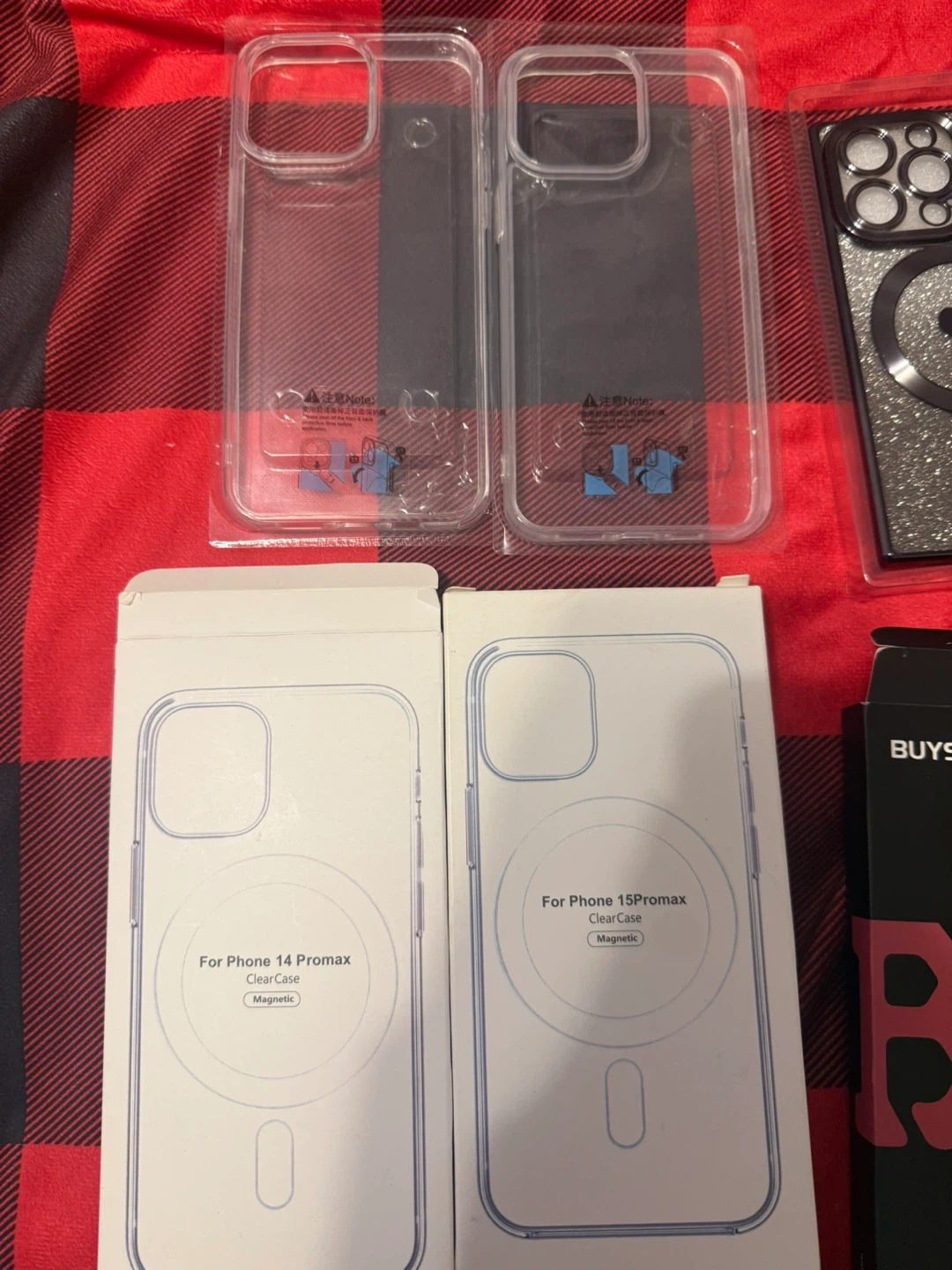 Includes two clear magnetic phone cases. One case is for iPhone 14 Pro Max and the other is for iPhone 15 Pro Max. Both cases are designed for clear protection and magnetic compatibility. They're made from a clear material.