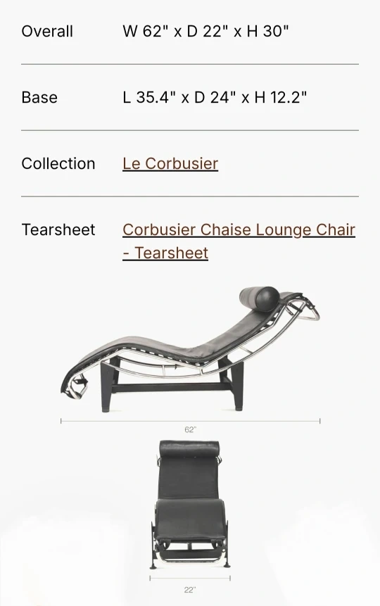 Selling a Le Corbusier Chaise Lounge Chair in black. It's a stylish and comfortable piece of furniture. The dimensions are W 62" x D 22" x H 30".