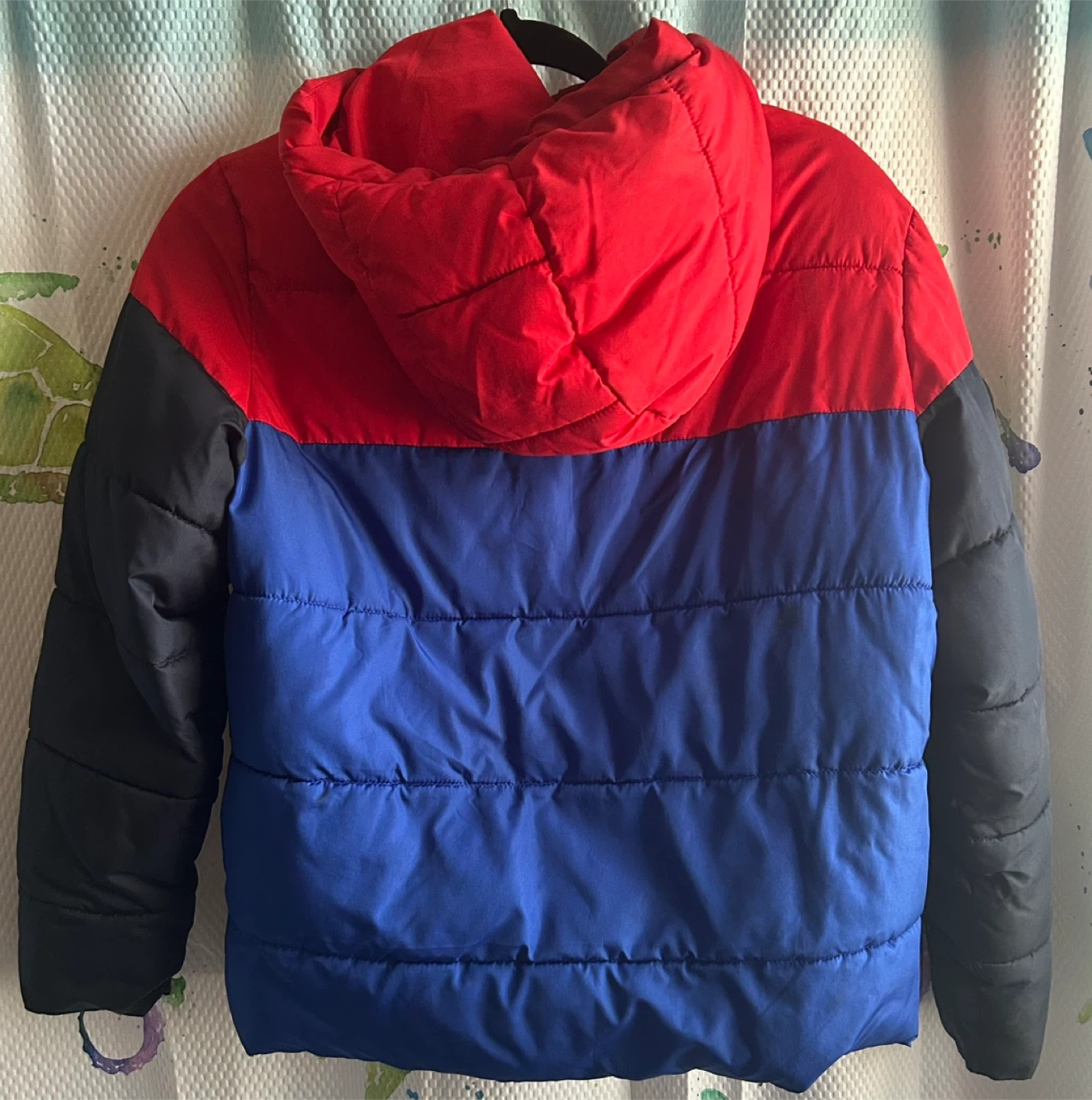 Selling a gently used GAP kids color block puffer jacket in size XL. It's a stylish and warm jacket, perfect for colder weather. The jacket features a color block design with red, blue, panels. It is in good condition and ready for a new owner!