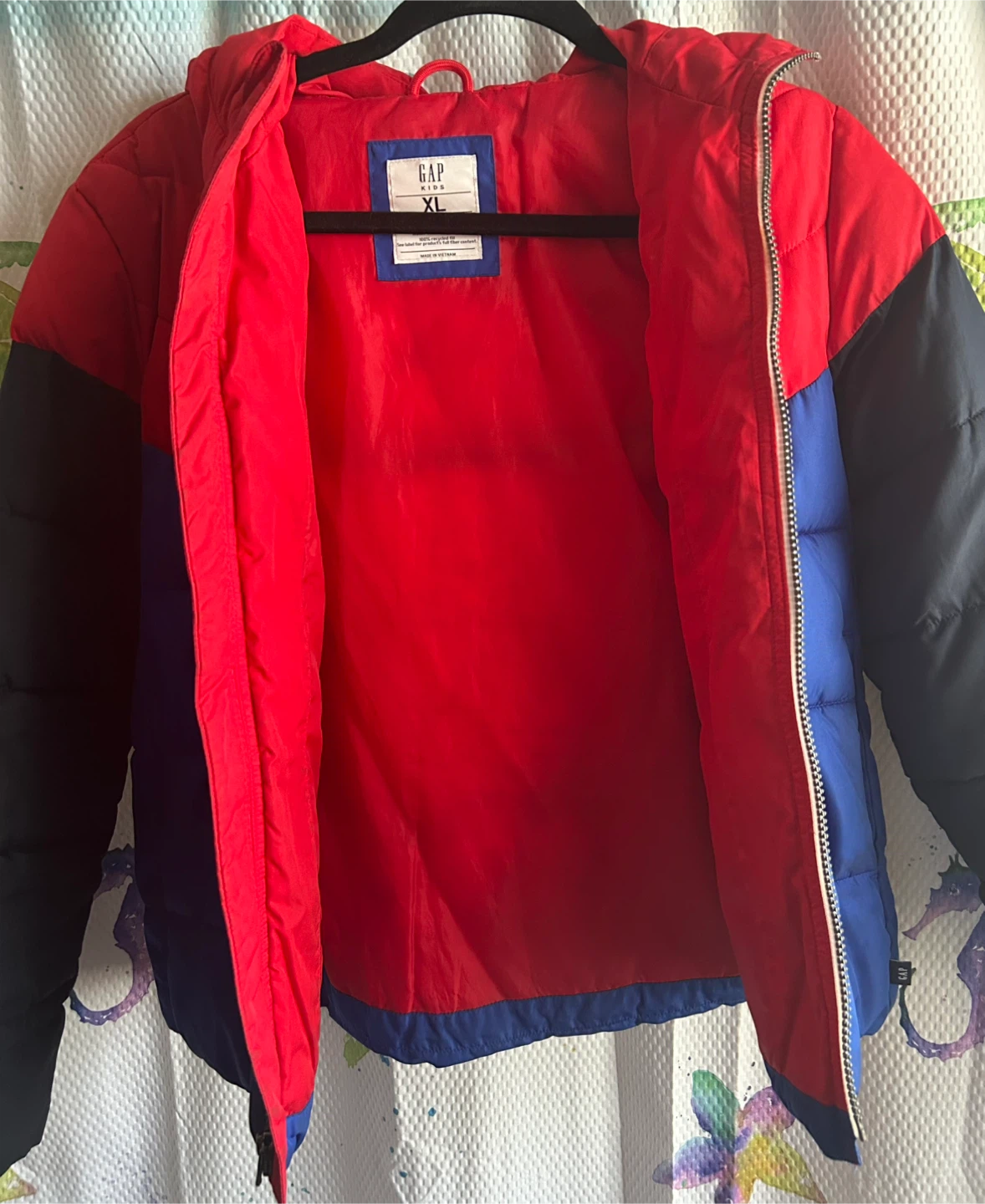 Selling a gently used GAP kids color block puffer jacket in size XL. It's a stylish and warm jacket, perfect for colder weather. The jacket features a color block design with red, blue, panels. It is in good condition and ready for a new owner!