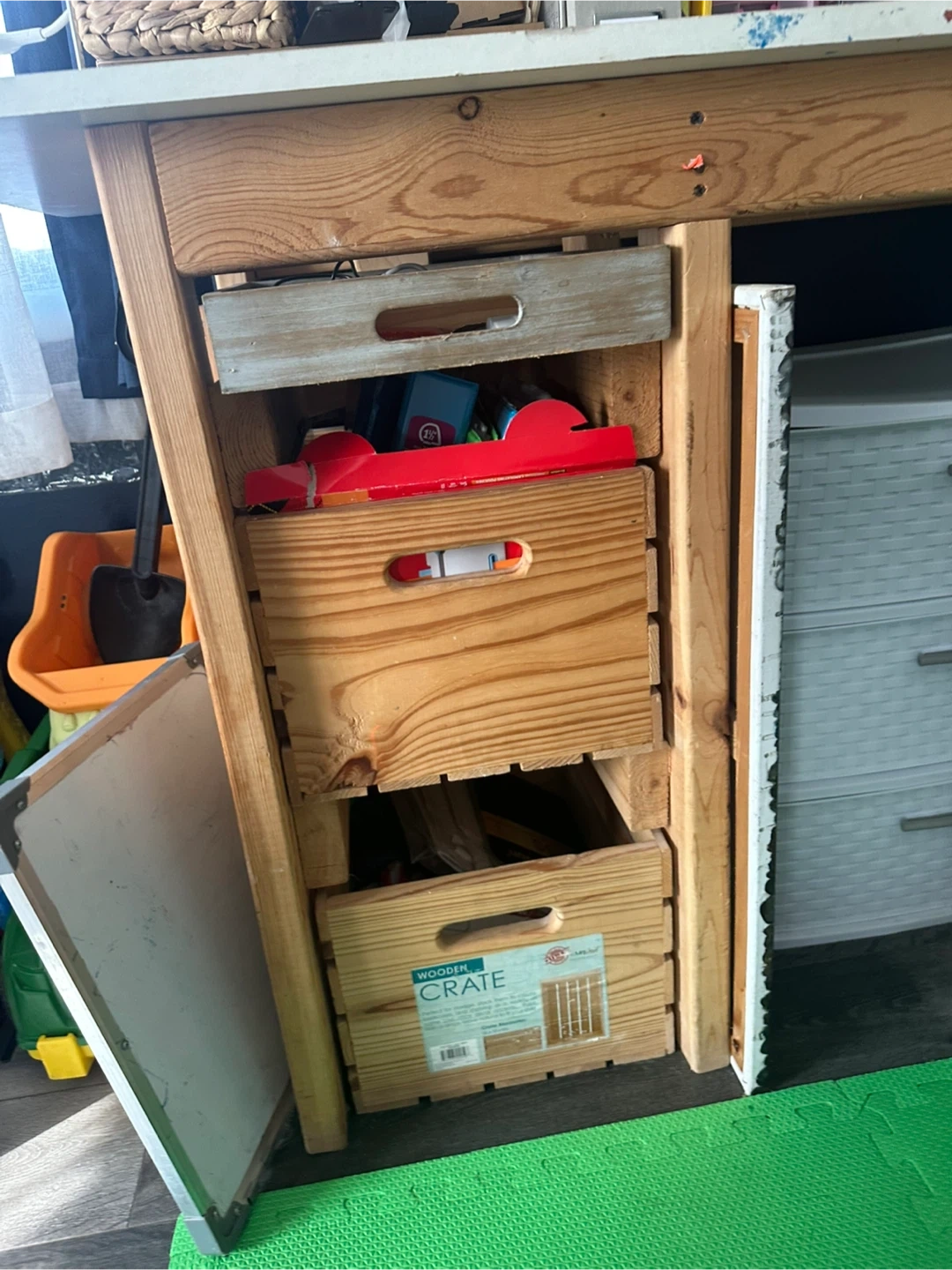 This is a wooden desk with built-in crate storage. It's perfect for a craft room or kids' play area. The crates provide a rustic and functional storage solution for toys, art supplies, or other items. It's in good condition and ready for a new home!
