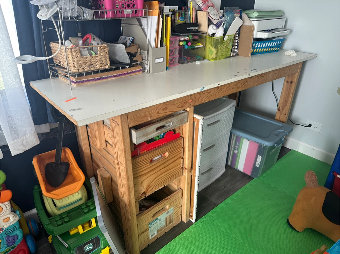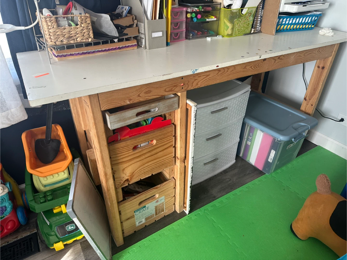 This is a wooden desk with built-in crate storage. It's perfect for a craft room or kids' play area. The crates provide a rustic and functional storage solution for toys, art supplies, or other items. It's in good condition and ready for a new home!