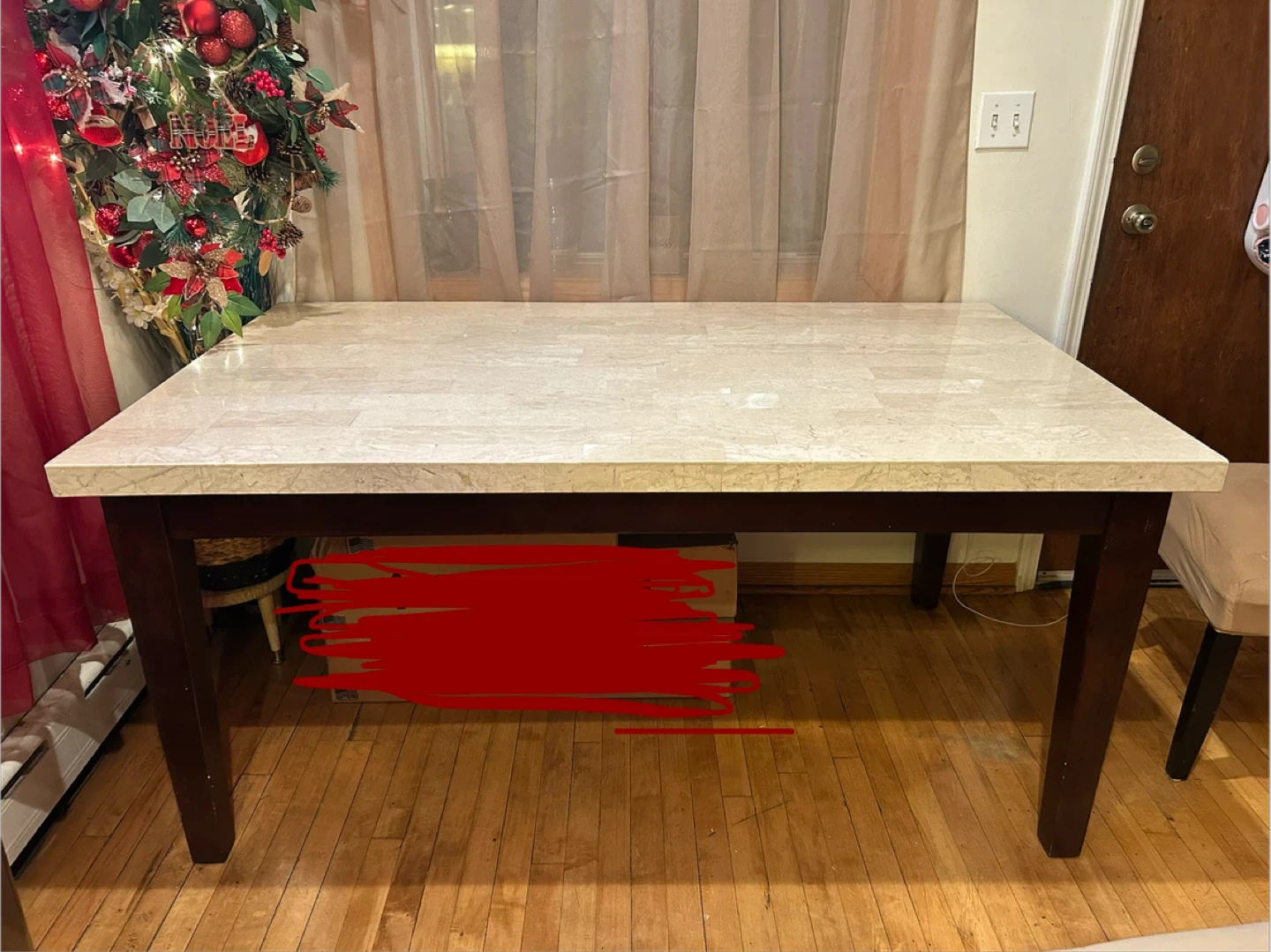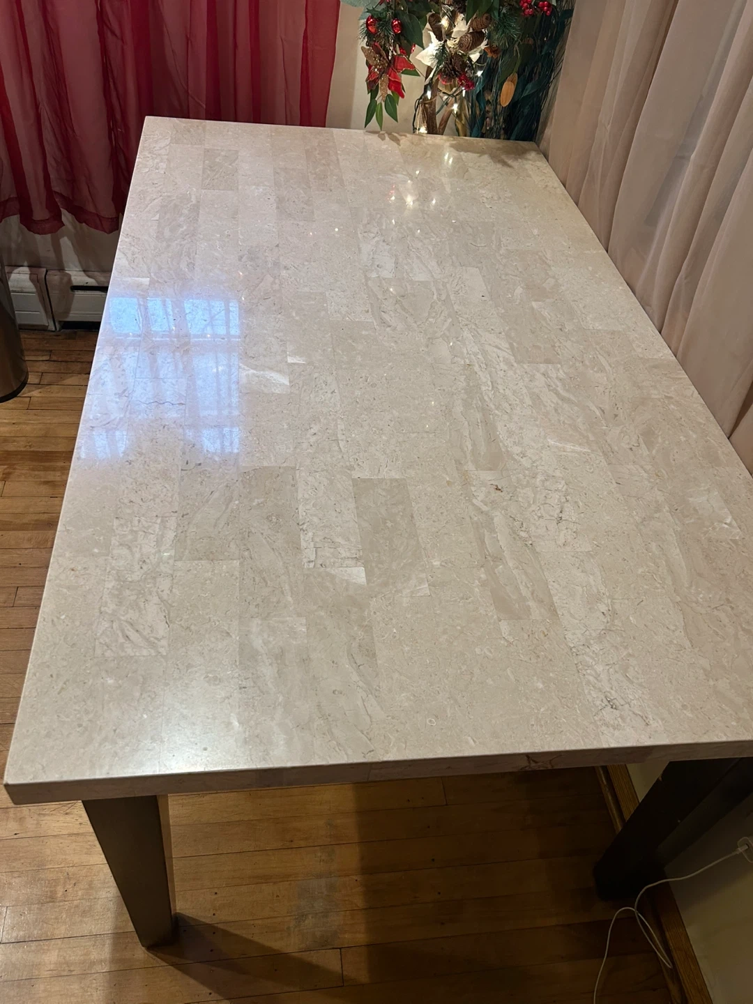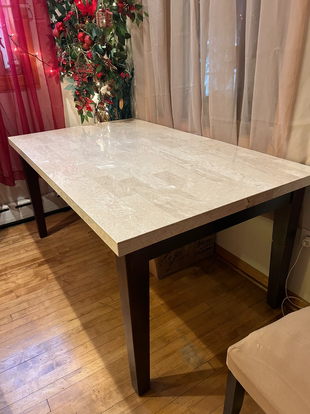 Selling a marble top dining table. This table is a heavy stone top with dark wood legs, and fits 6 chairs. There are minor scratches on the wooden legs, but the marble top is fully intact with no chips/damages in the stone.