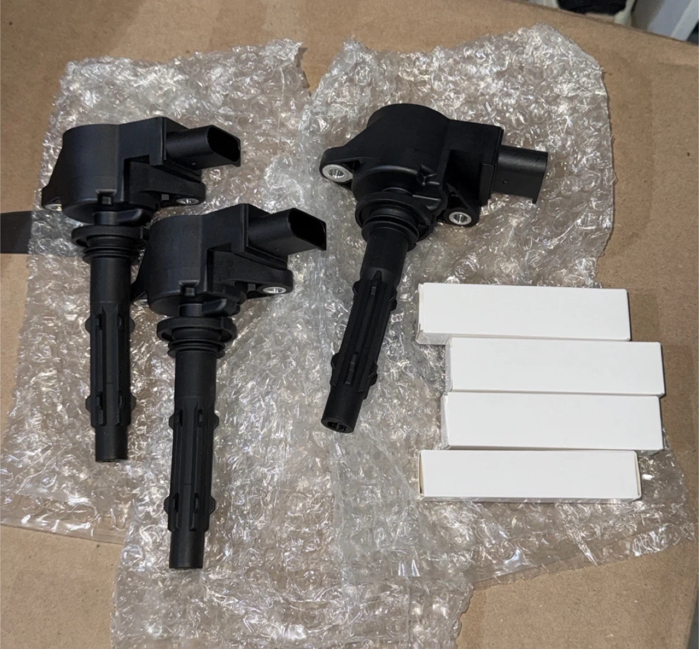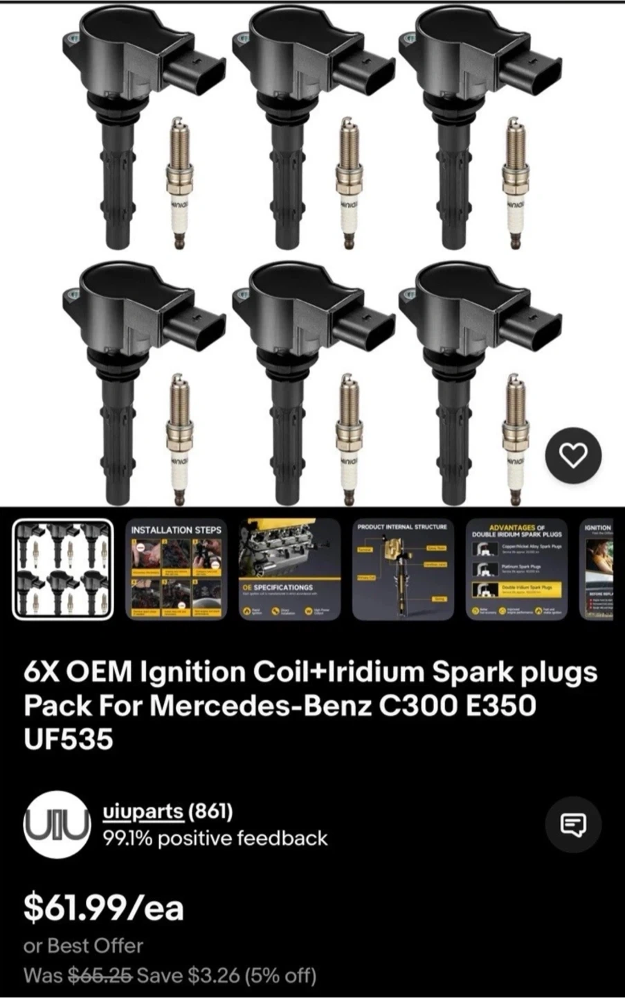 10Selling a set of 6 OEM ignition coils and iridium spark plugs for Mercedes-Benz C300 E350 UF535. These parts appear to be in good condition and ready for installation