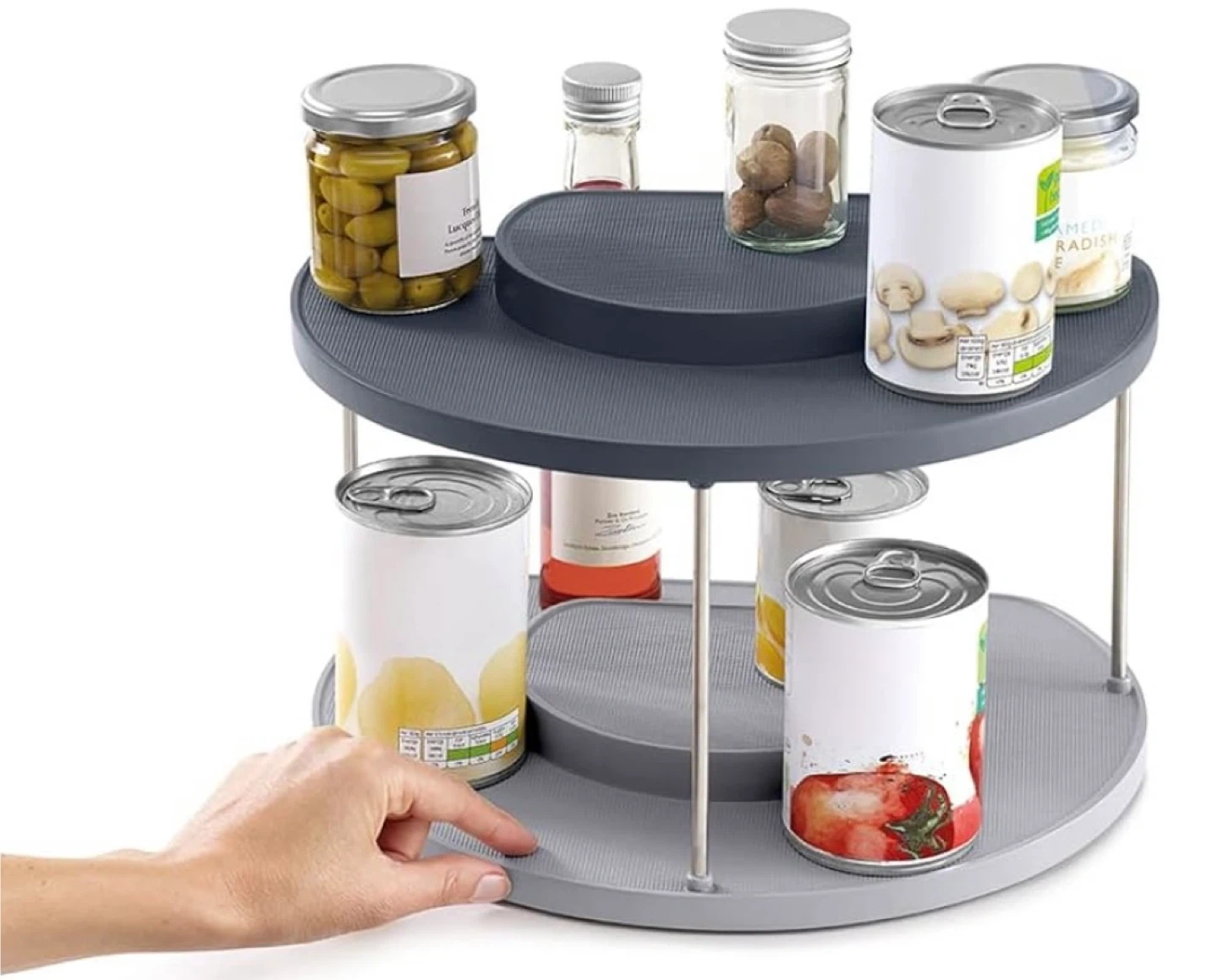 This is a 2-tier rotating organiser designed for cupboards. It features a flat front edge to save space and improves visibility and access. The organiser offers 360-degree rotation.