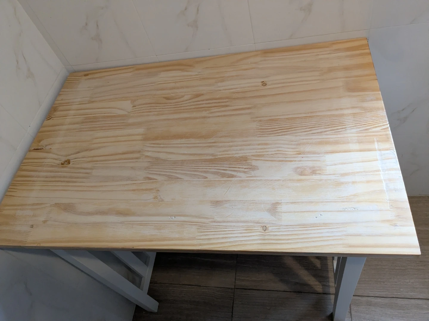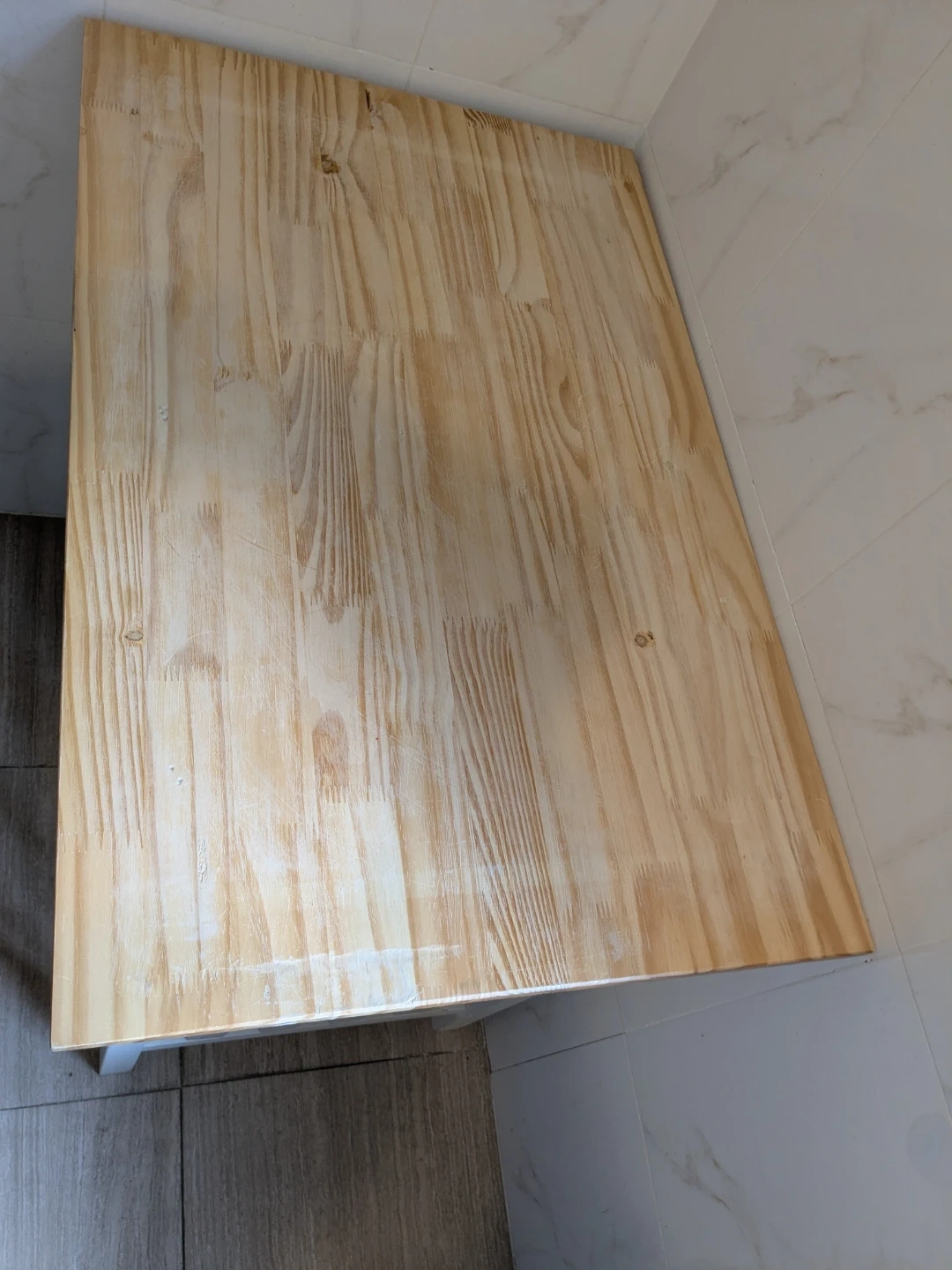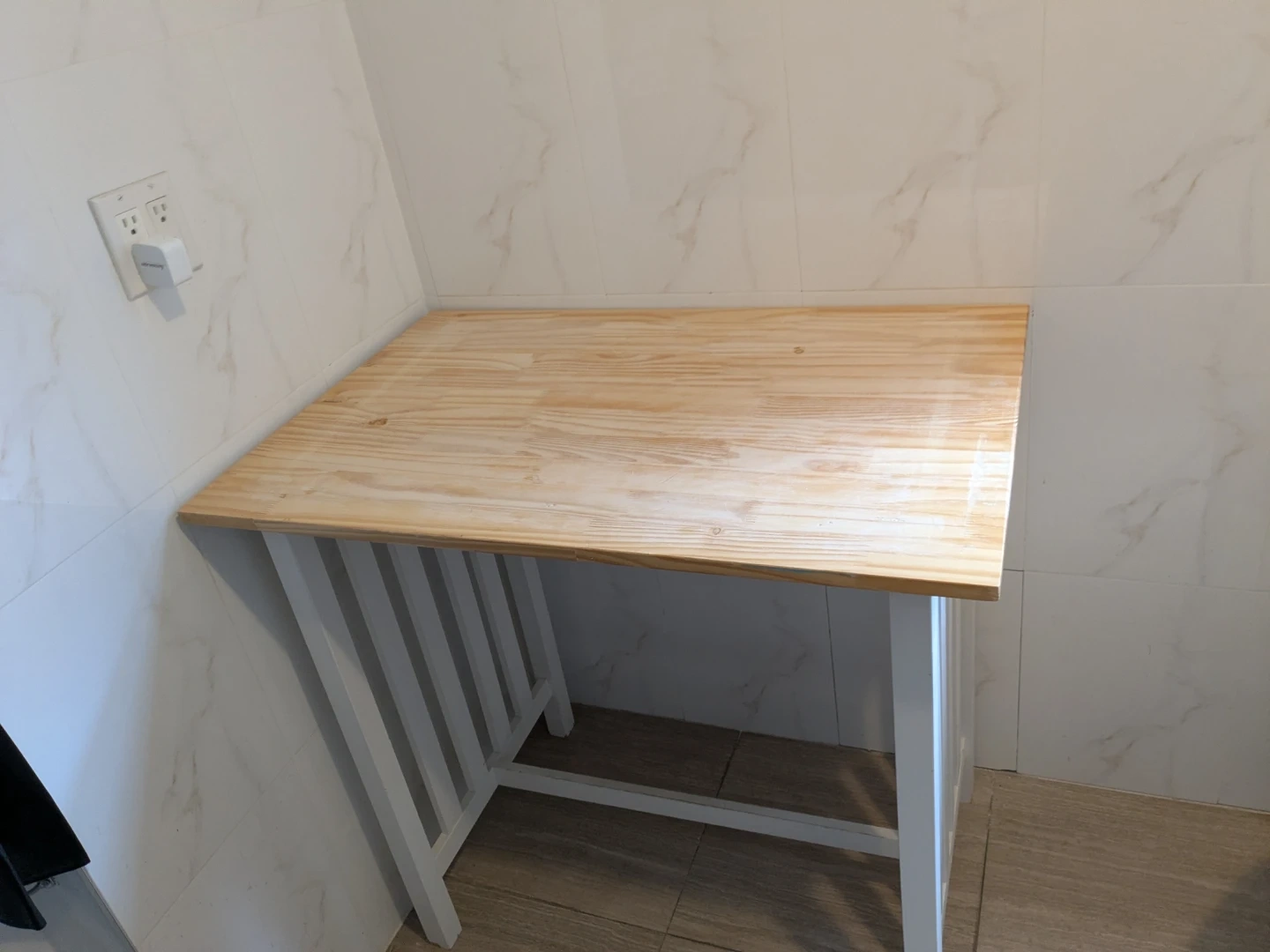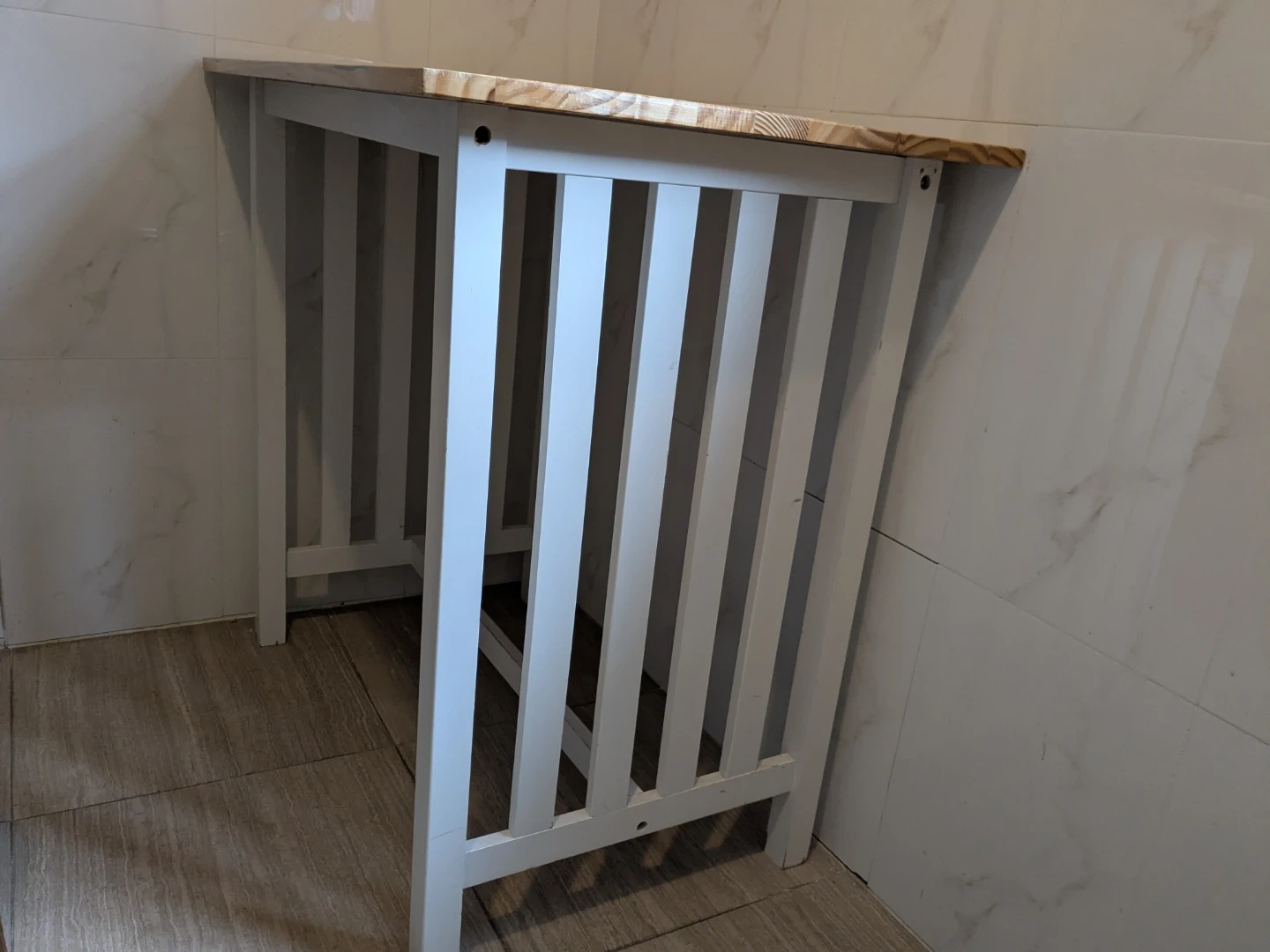 This console table features a natural pine wood top with a white slatted base. It's a narrow table that fits well in smaller spaces, but it appears to be a standard console table size.