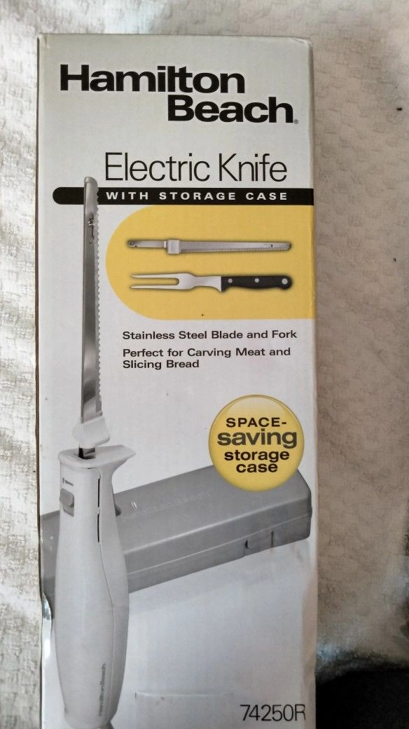 Hamilton Beach electric knife with storage case, stainless steel blade and fork. Perfect for carving meat or slicing bread. White color.