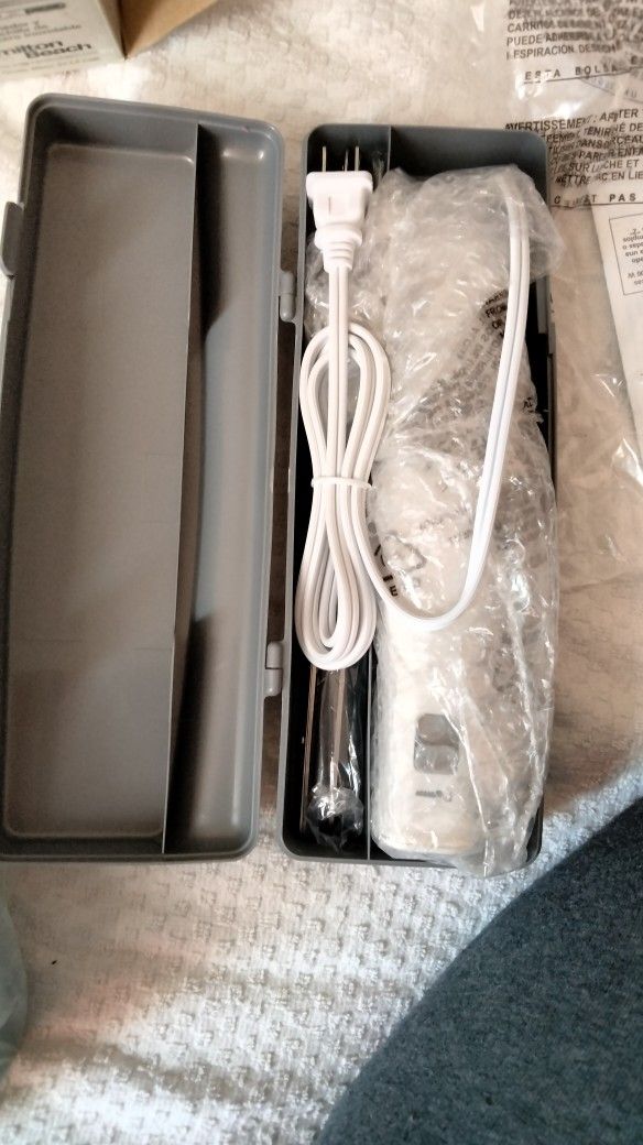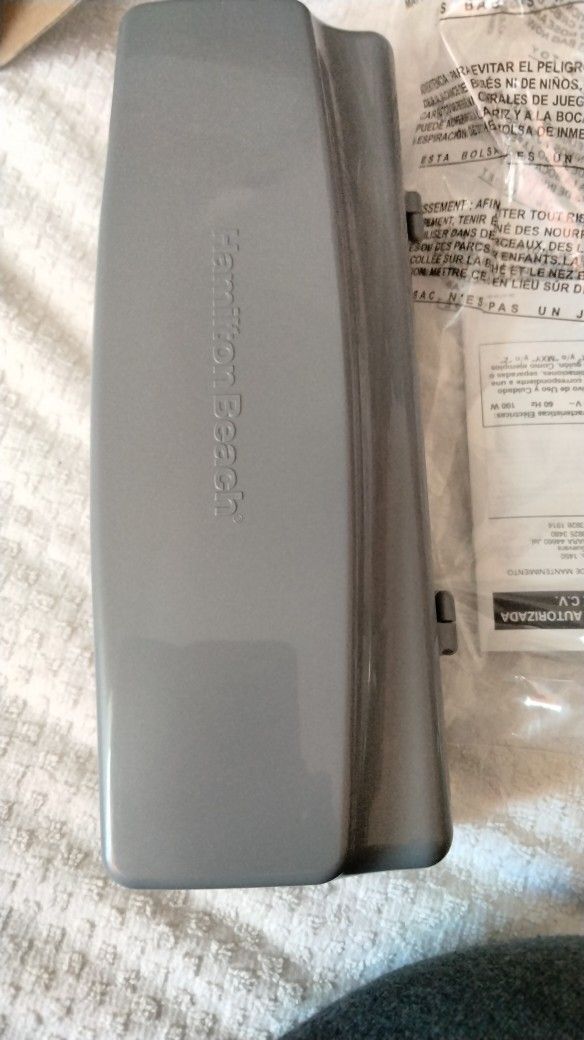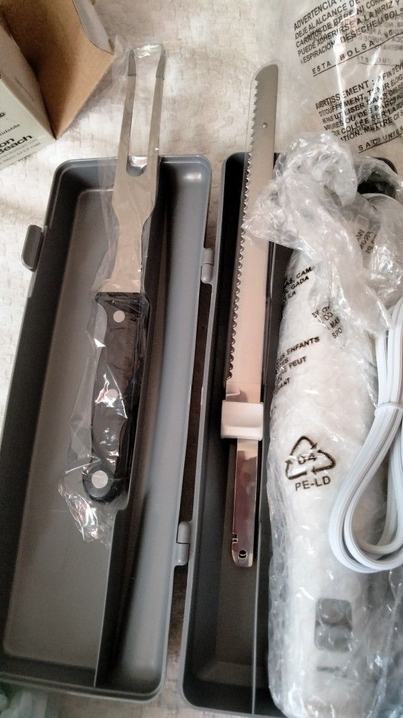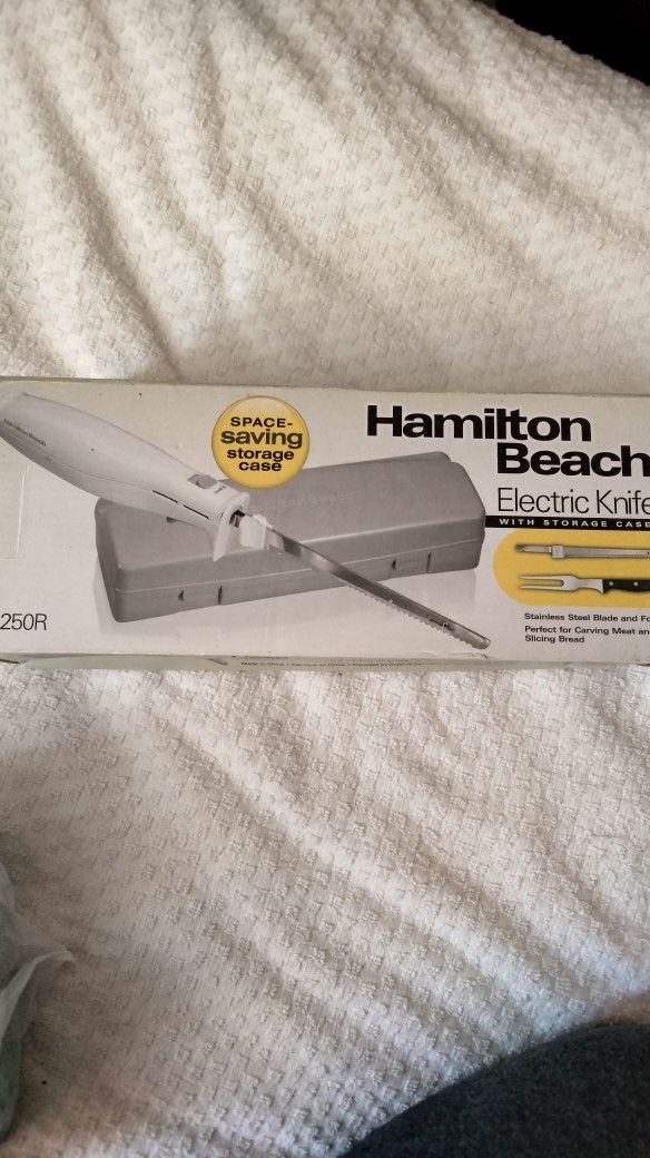Hamilton Beach electric knife with storage case, stainless steel blade and fork. Perfect for carving meat or slicing bread. White color.