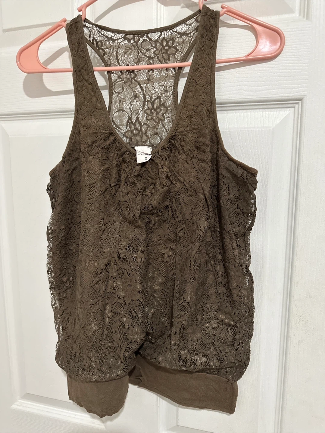 Brown lace racerback tank top. Features a delicate floral lace overlay with a solid brown lining. It's size medium.