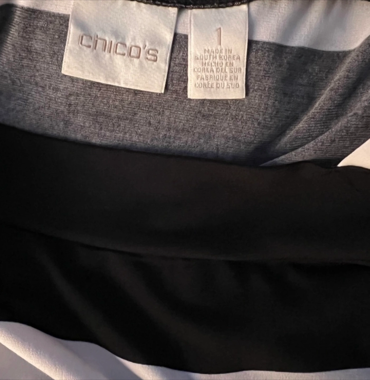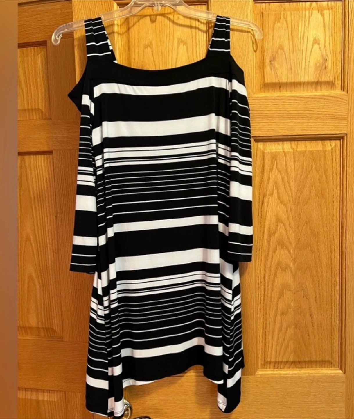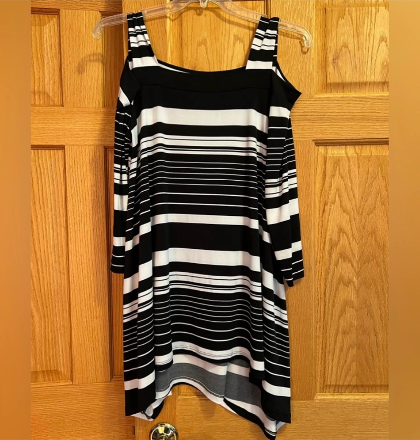 Cute Chico's dress with a black and white striped pattern! It's a size 1, perfect for a casual or dressy look. The material is comfortable and flowy, making it great for warmer weather. The dress features a unique cold shoulder design, adding a touch of style. Top look adorable with leggings and boots.