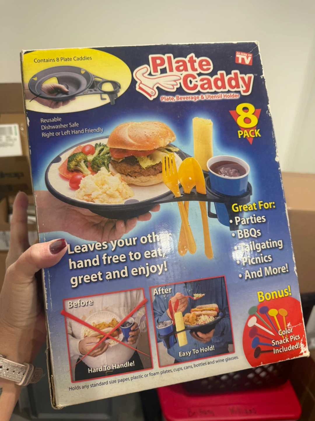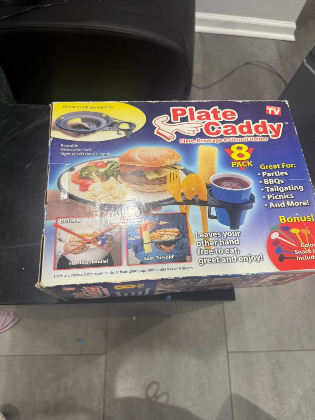 Selling a Plate Caddy 8-pack! It's a plate, beverage, and utensil holder. Great for parties, BBQs, tailgating, picnics, and more! It's reusable and dishwasher safe. Right or left-hand friendly. Comes with color snack picks included!