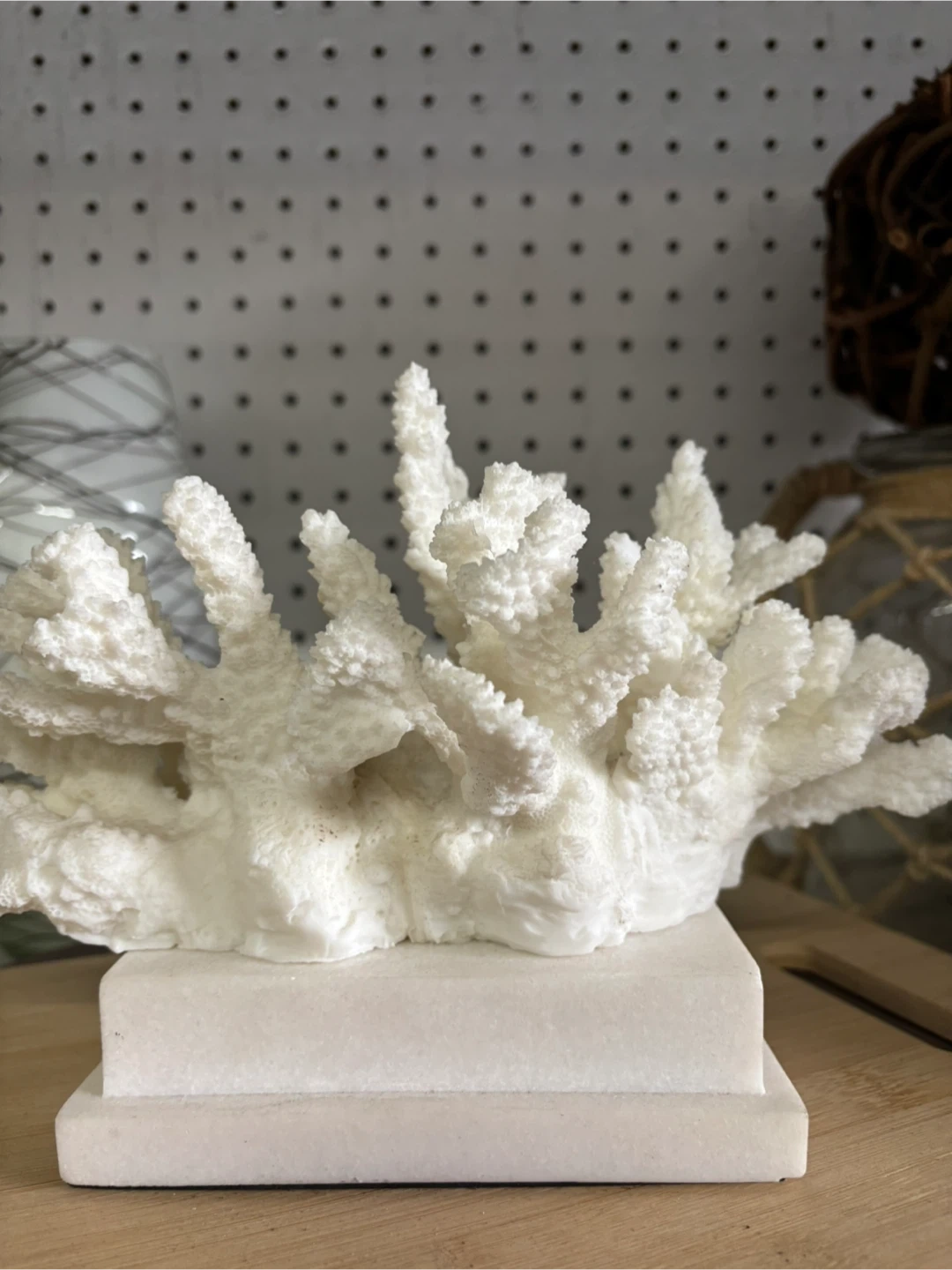 White decorative coral piece mounted on a marble base. Adds a touch of coastal style to any space. Measures approximately 8 inches wide. Marble base.
