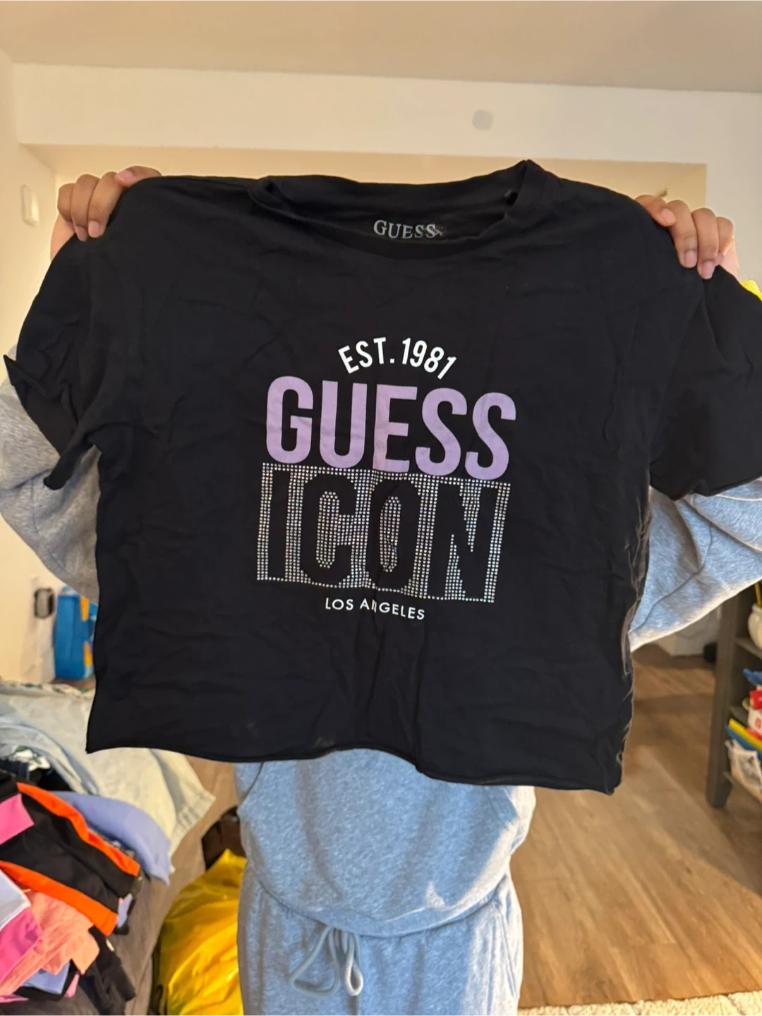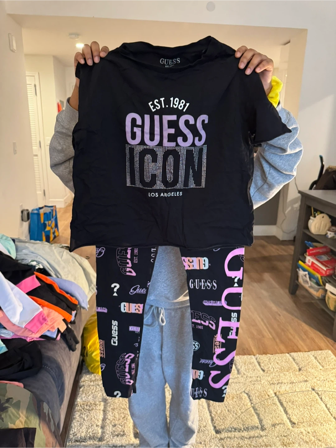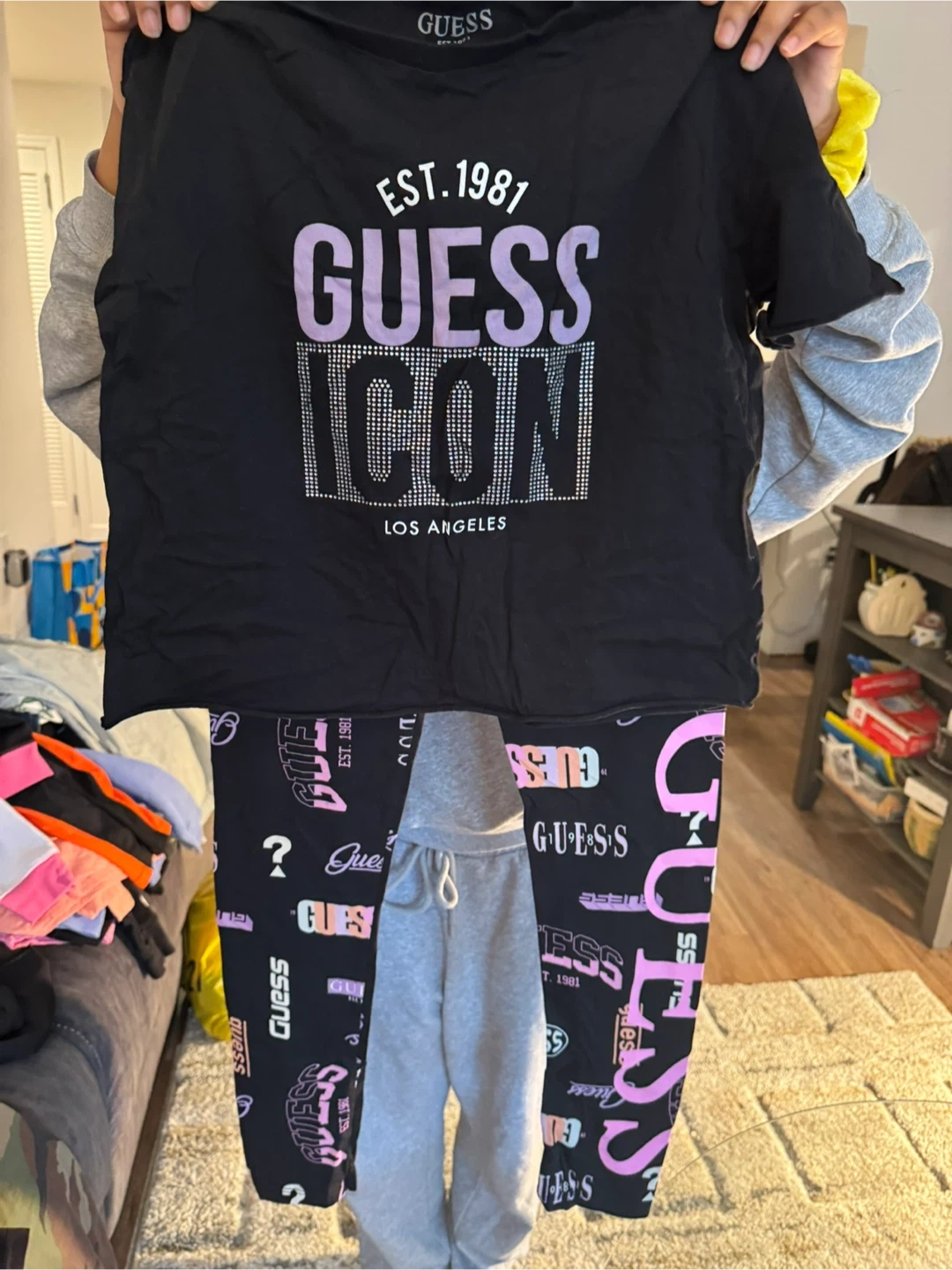 This is a black Guess t-shirt and matching black leggings set. The t-shirt has 'EST. 1981 GUESS ICON LOS ANGELES' graphic. The leggings have a repeating Guess logo pattern. It's a stylish outfit for everyday wear!