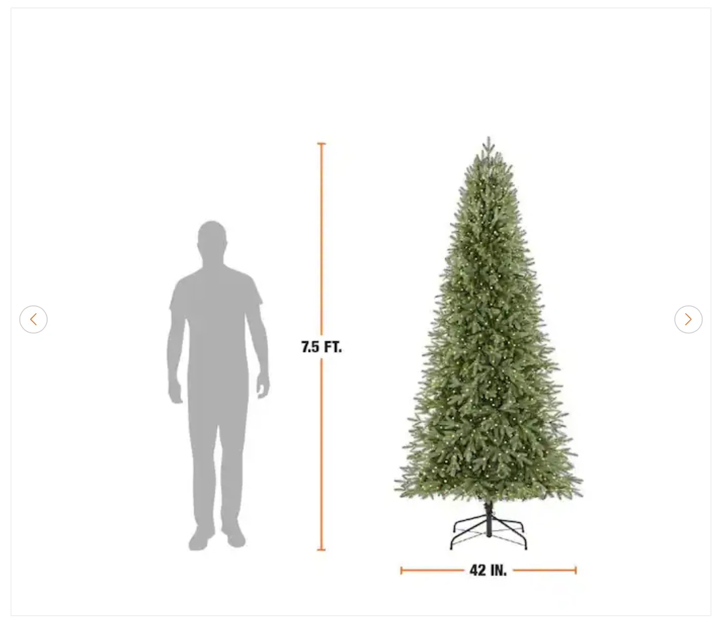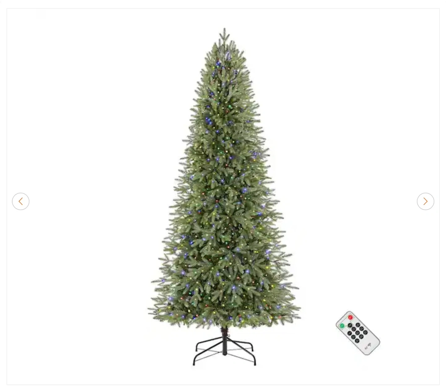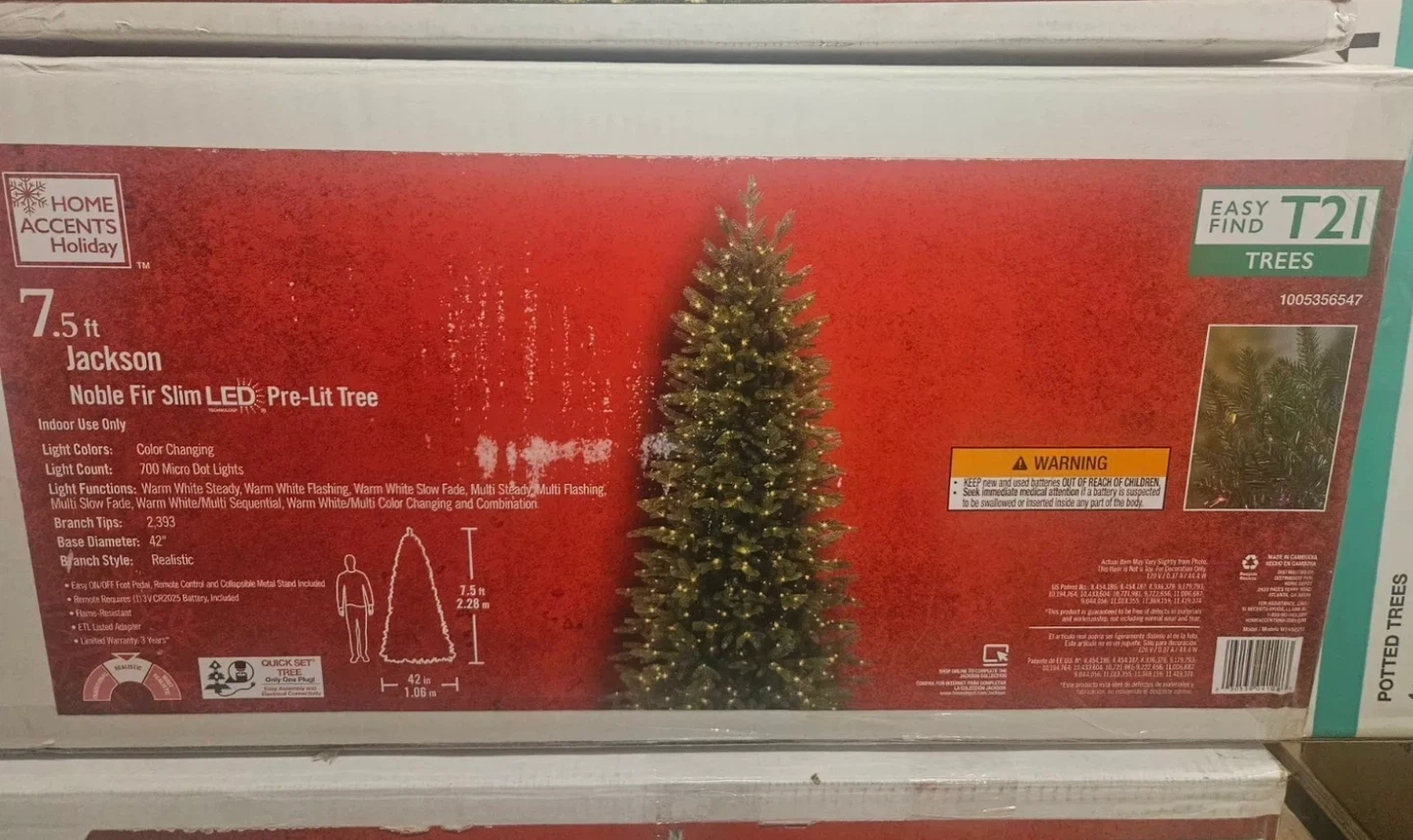 Brand New Home Accents Holiday 7.5 ft. Jackson Noble Fir Slim LED Pre-Lit Artificial Christmas Tree Indoor use only Color changing LED lights 700 LED micro dot lights Light functions: warm white steady, warm white flashing, warm white slow fade, multi color steady, multi color flashing, multi color slow fade, warm white/multi color sequential, warm white/multi color changing, and combination 2393 branch tips 42-inch diameter base 7.5-foot height Realistic branch style Easy ON/OFF foot pedal, remote control, and collapsible metal stand included Remote requires (1) 3V CR2025 battery, included Flame-resistant ETL listed adapter