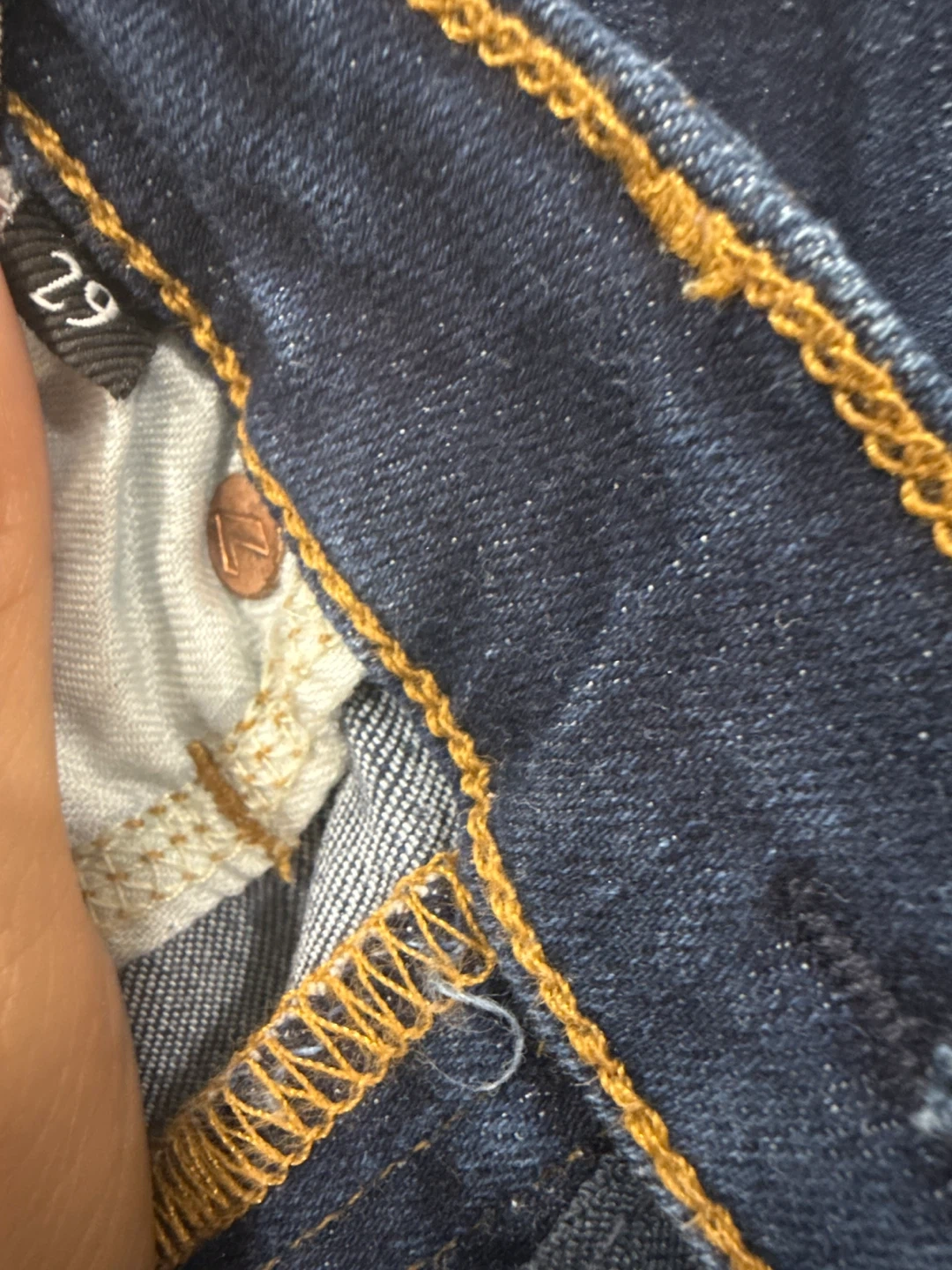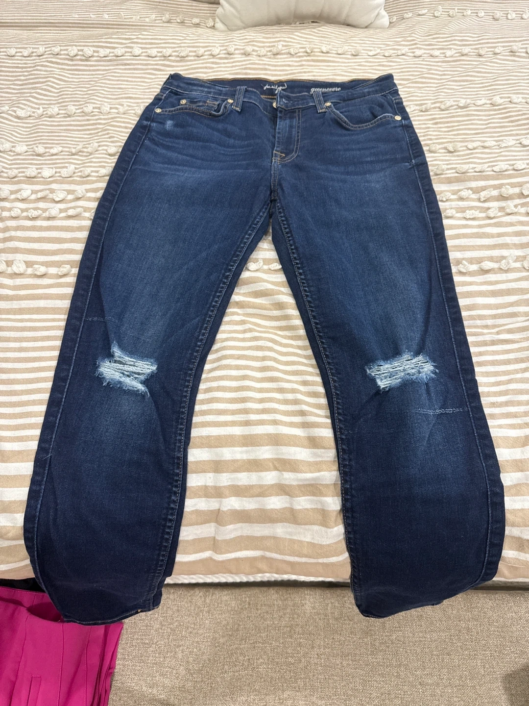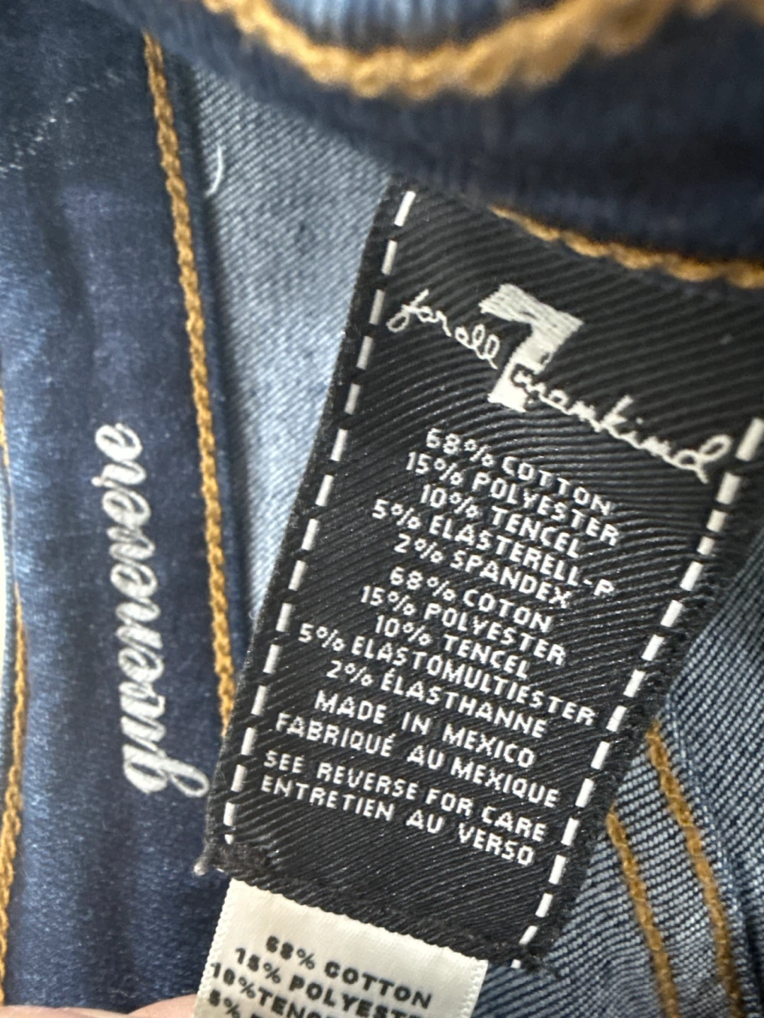 15Selling a pair of 7 For All Mankind 'Gwenevere' jeans in size 29. They are made of 68% cotton, 15% polyester, 10% tencel, 5% elastrell-p, and 2% spandex. There is some distressing on the jeans.