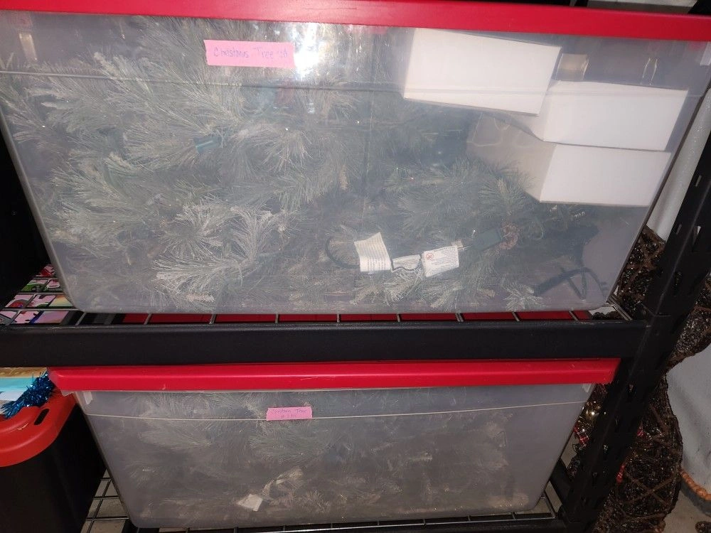 Approximately 7' tall artificial tree. Lightly Flocked traditional PVC branch tips with glitter accents and real tempered pine cones. Long, wispy pine needles with realistic faux wood sprig tips are amazingly realistic. Needs no additional decorations! Warm White LED mini lights and authentic screw-in G40 incandescent bulbs. Steel pole and fully hinged construction. Includes Steel stand and foot switch power cord. Height of tree is measured in the stand. Tree assembles with just a few sections for easy setup. $200 WITH the storage bins.