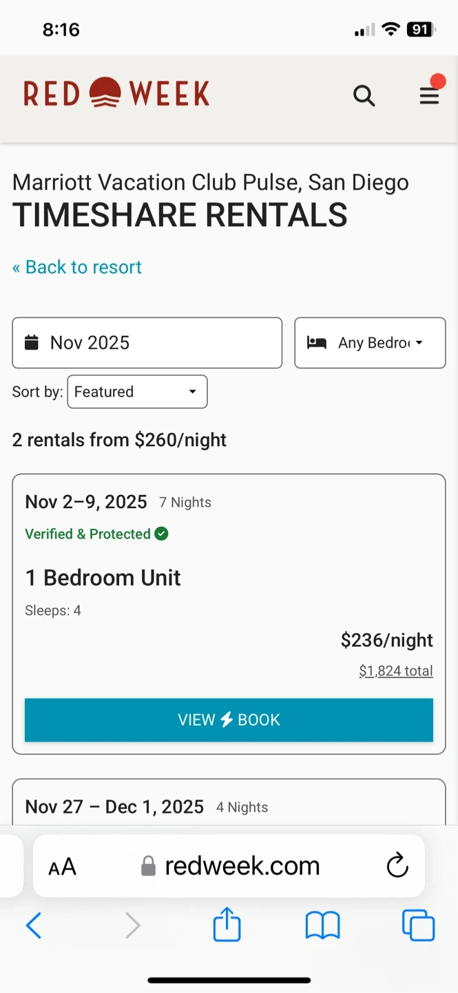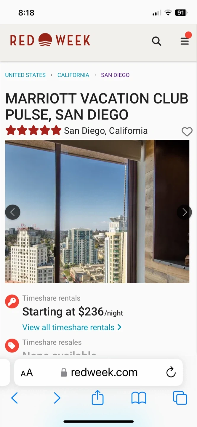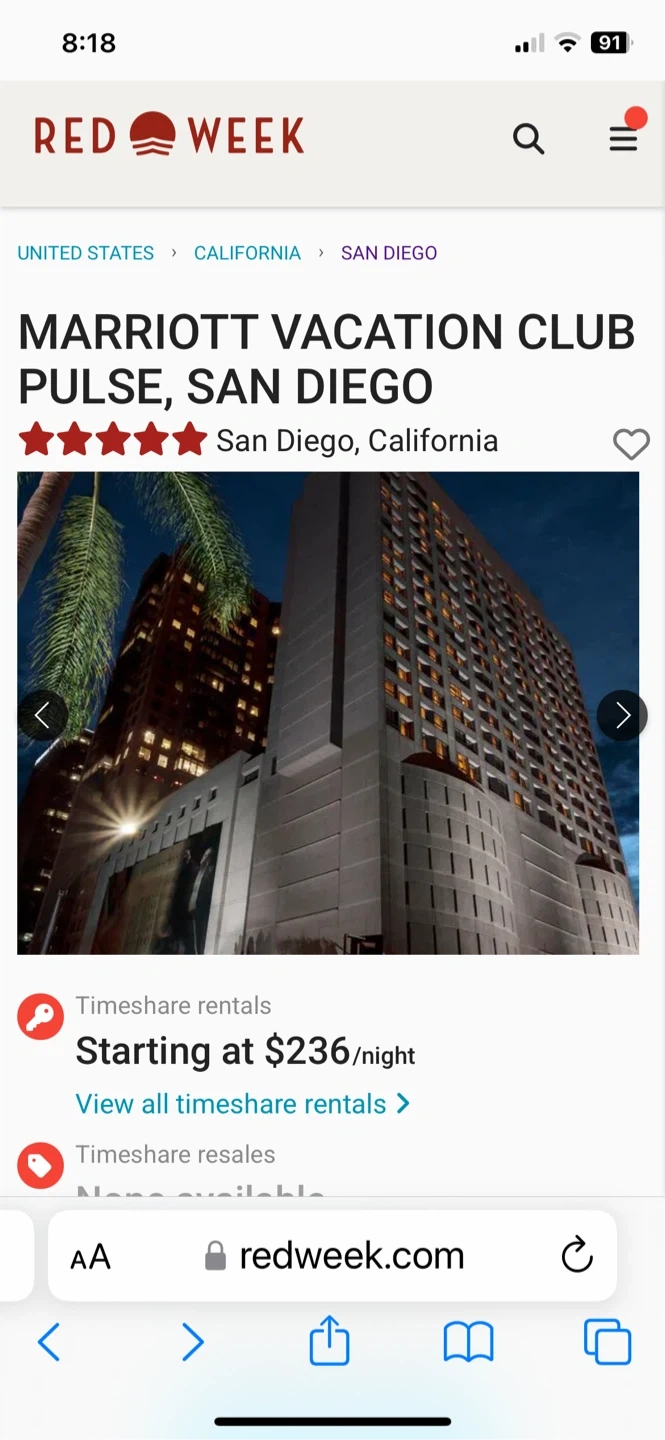 Great deal 7 nights at Marriott’s pulse down town San Diego,CA, verified and protected by red week, you got go to red week. com to book it directly with them , about $260 a night including all fees and taxes
