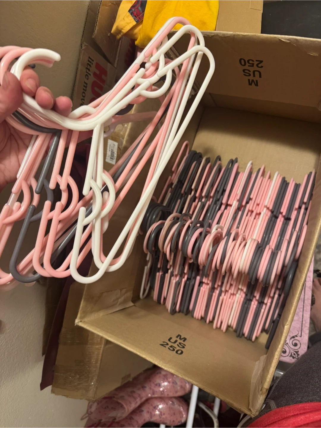 Selling a bunch of clothes hangers! They come in a mix of pink, white, and gray colors. There are 70 hangers in the box