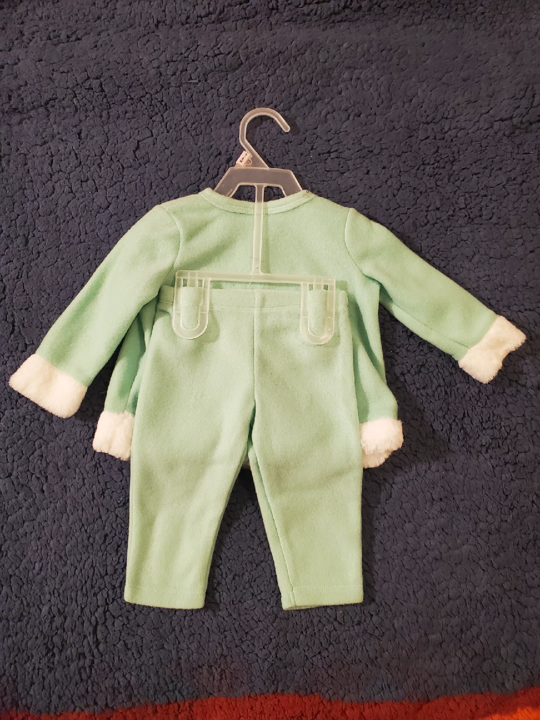 65Super cute Swiggle's outfit in a soft mint green! It features a top and pants with adorable cat face designs. The top has button closures and fuzzy white trim, and the pants are a matching solid color. Perfect for a baby girl!
