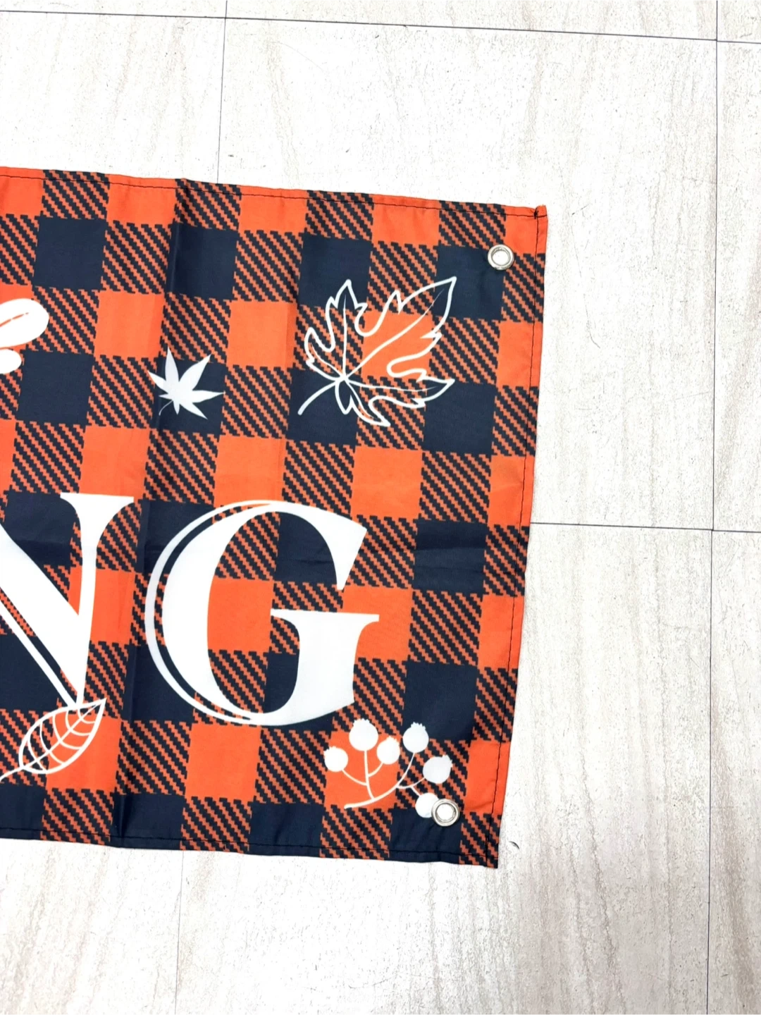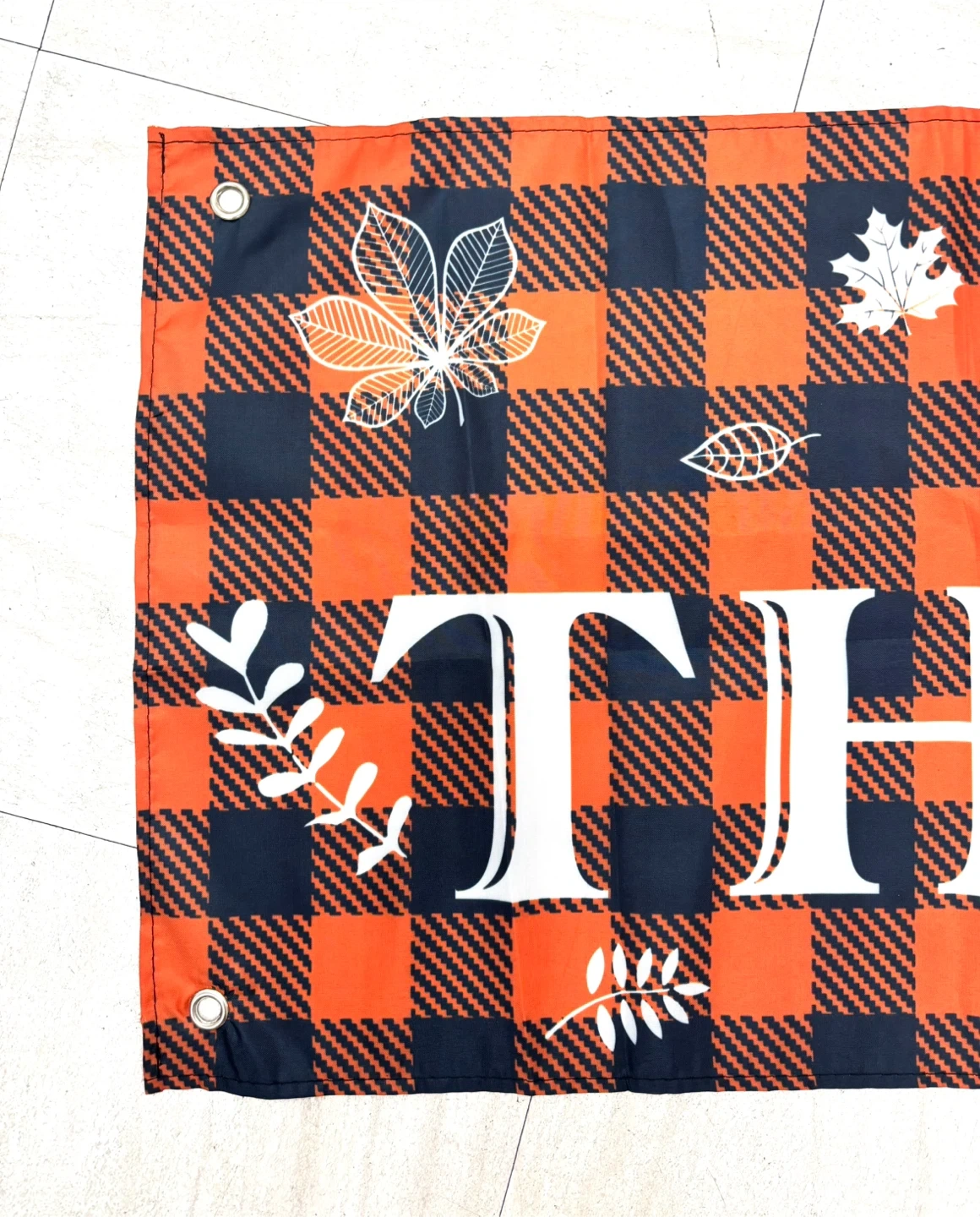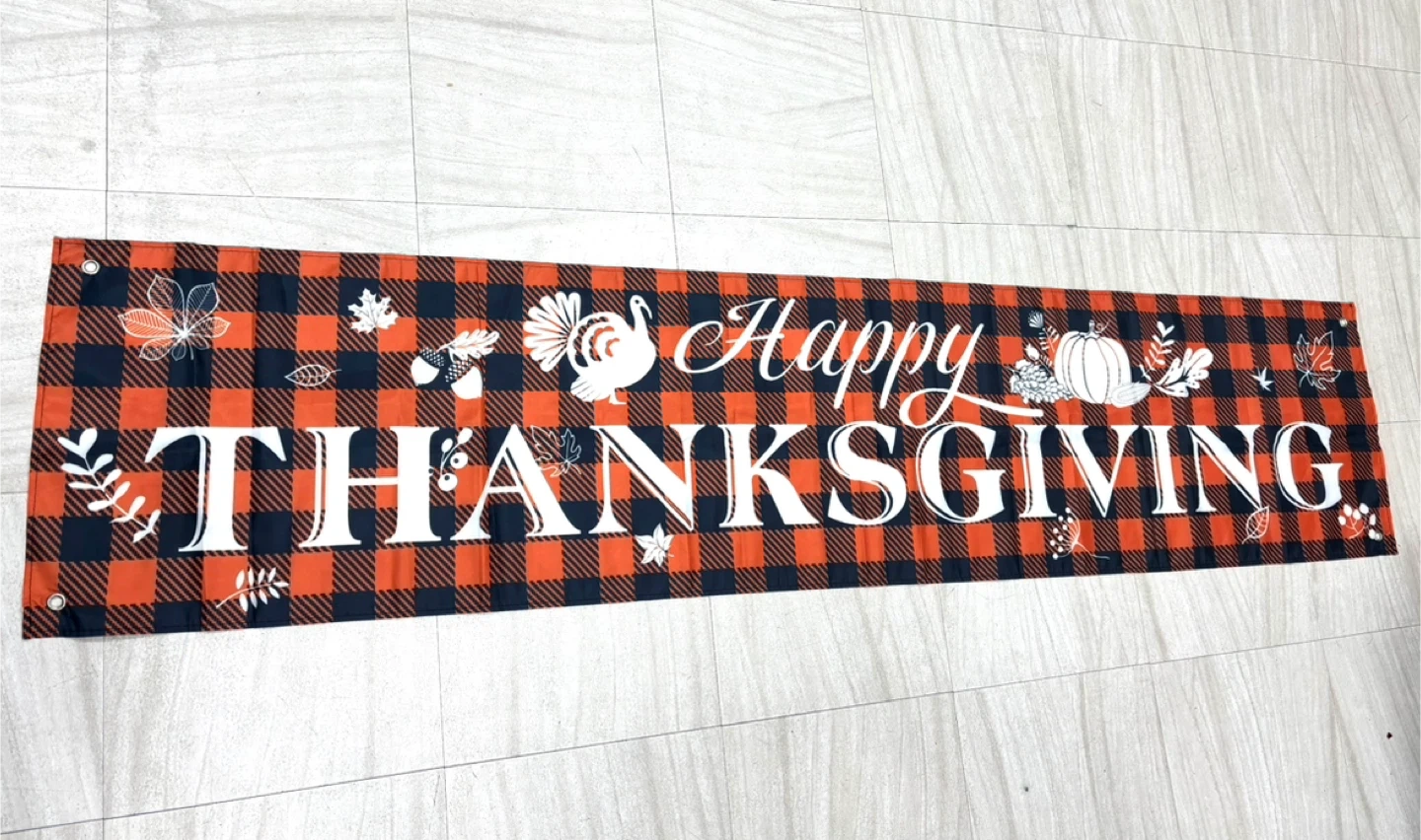 150Large thanksgiving banner, decoration, material: polyester, hanging mount, it has grommet hole on the 4 corners and fix it to the wall, fence, garage door, window, tree and garden.