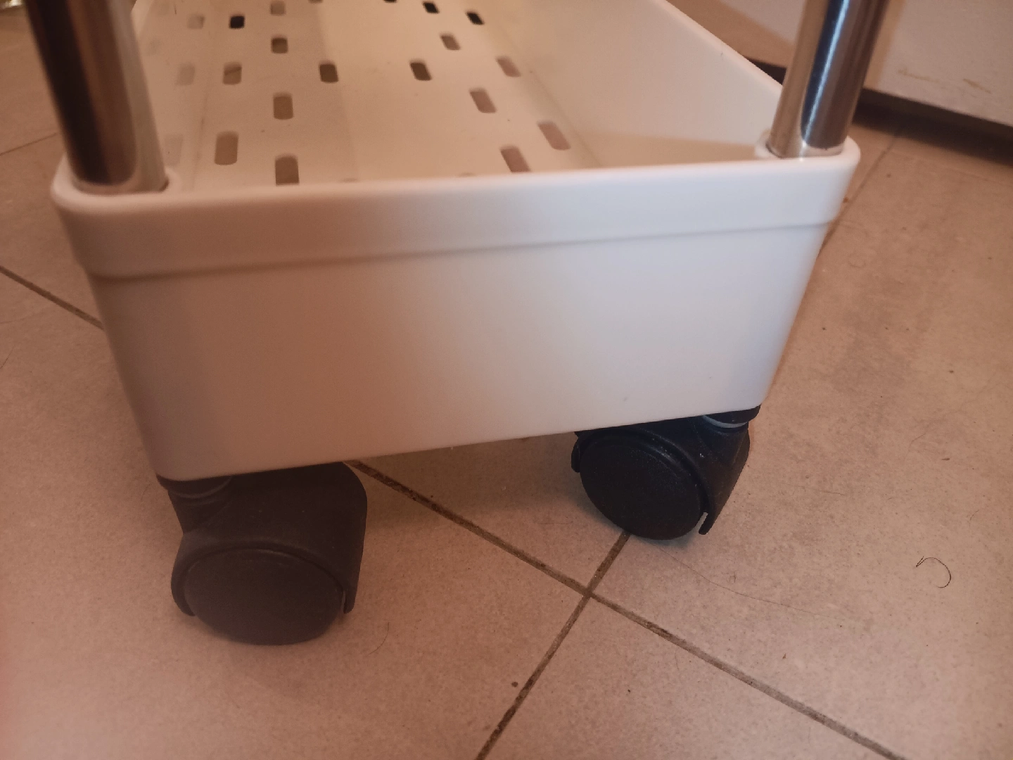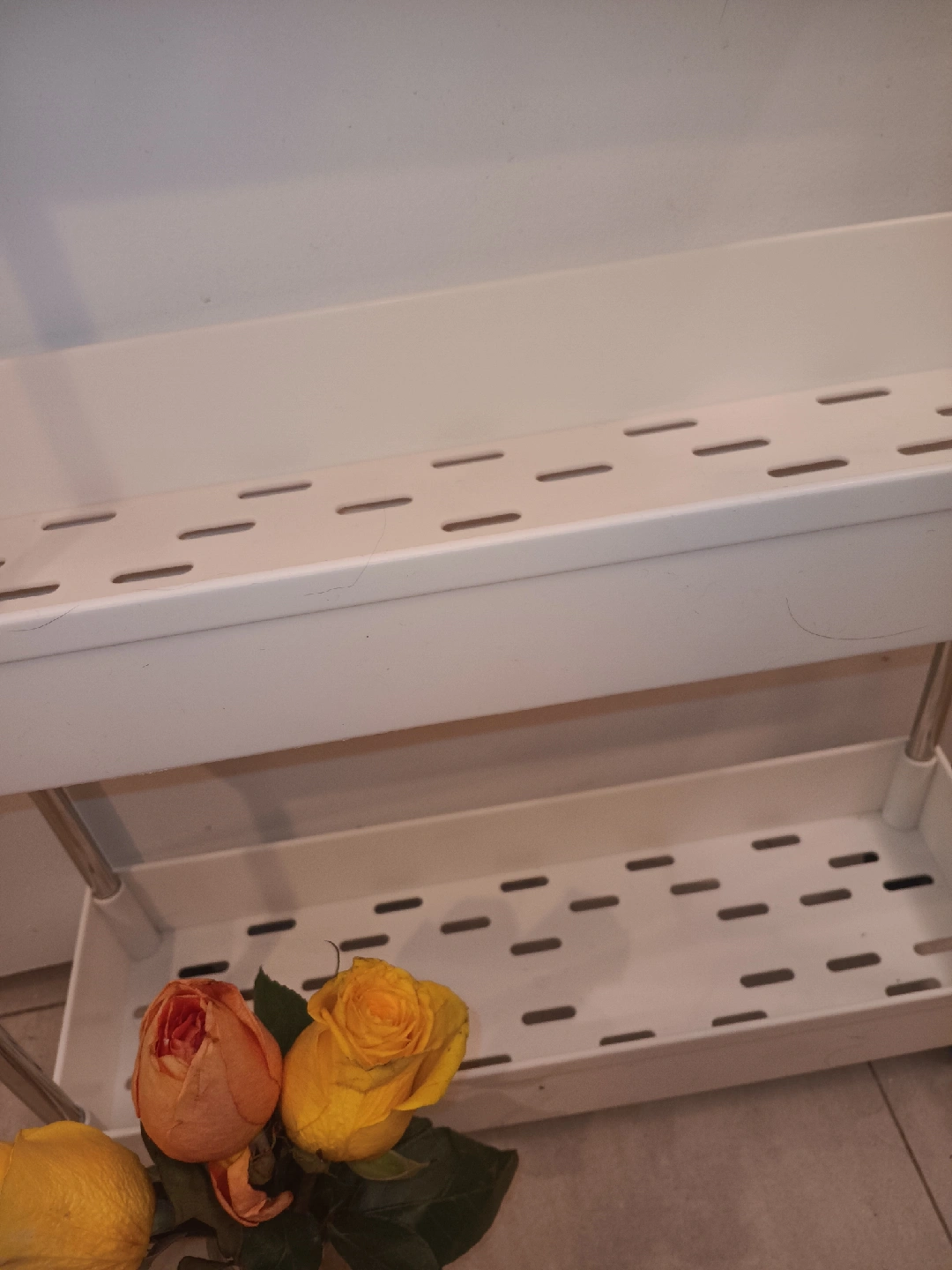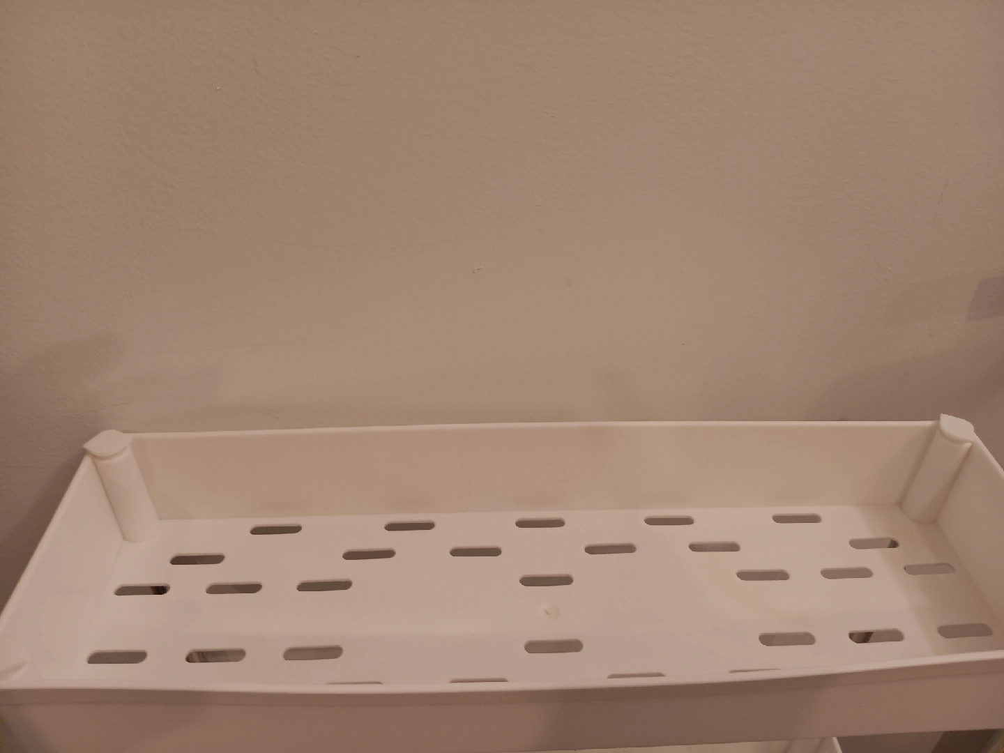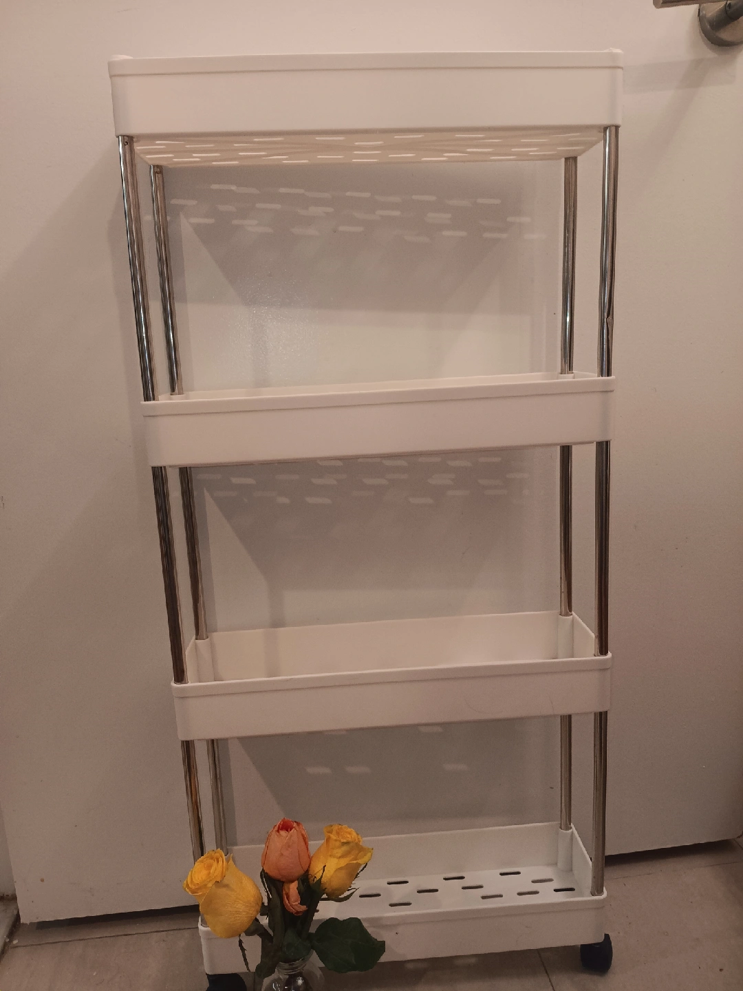 756This is a thin, rolling storage cart with three tiers. It's white and in great condition. Perfect for organizing items in your kitchen, bathroom, or any other space where you need some extra storage