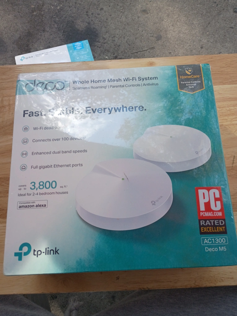 65Selling a TP-Link Deco M5 1300 Whole Home Mesh Wi-Fi System! It features: - Seamless Roaming - Parental Controls - Antivirus - Wi-Fi dead-zone killer - Connects over 100 devices - Enhanced dual band speeds - Full gigabit Ethernet ports - Covers up to 3,800 sq ft - Ideal for 2-4 bedroom houses - Compatible with Amazon Alexa