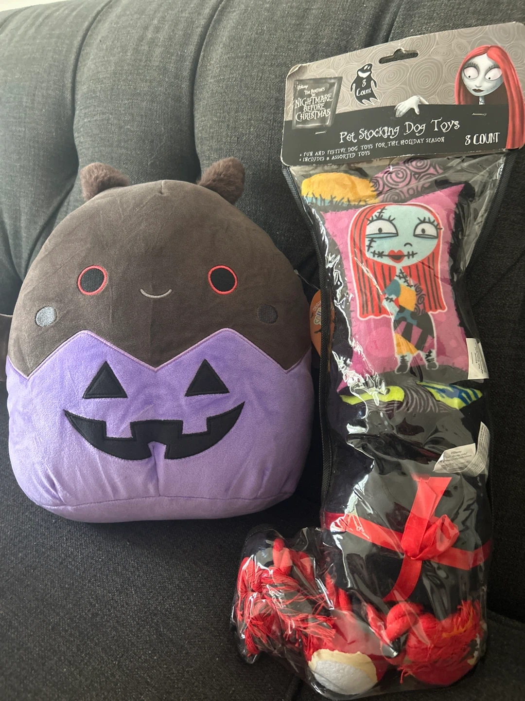 15Selling a pet stocking dog toys (8 count) and a Jack-o'-lantern Squishmallow! The dog toys are fun and festive for the holiday season and include assorted toys. The Squishmallow is super soft and huggable!