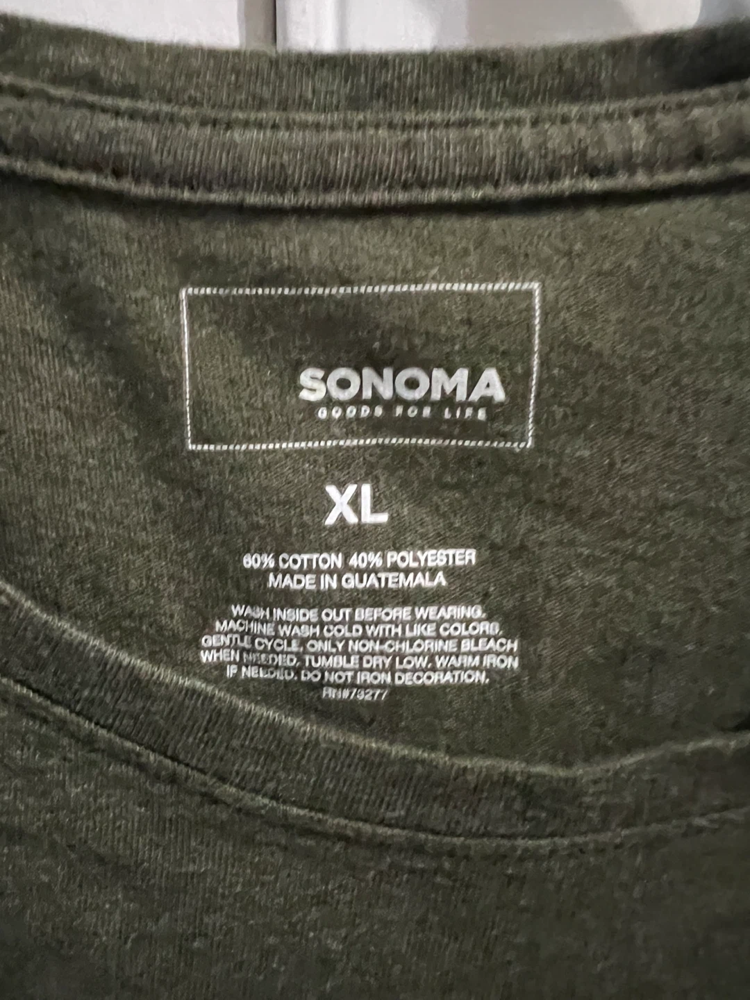 629I'm selling a Sonoma olive green t-shirt, size XL. It's made of 60% cotton and 40% polyester. The shirt has a fun "Live Music Fest" peace sign design on the front!