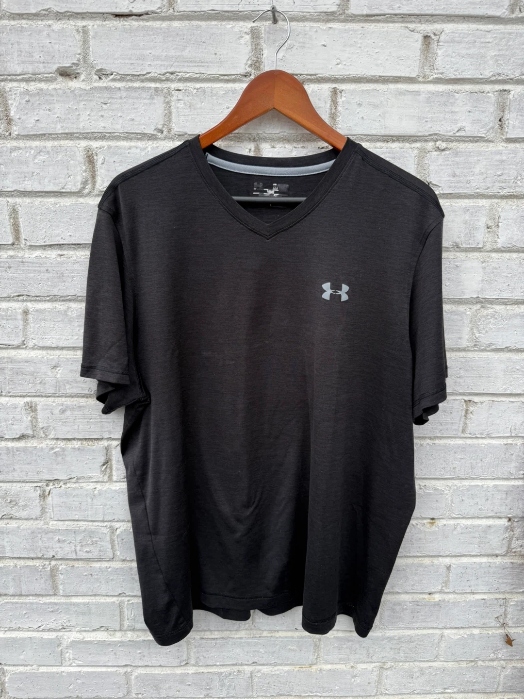 Selling a black V-neck shirt from Under Armour. It's in good condition and ready for a new home! Perfect for workouts or casual wear. The material is lightweight and breathable