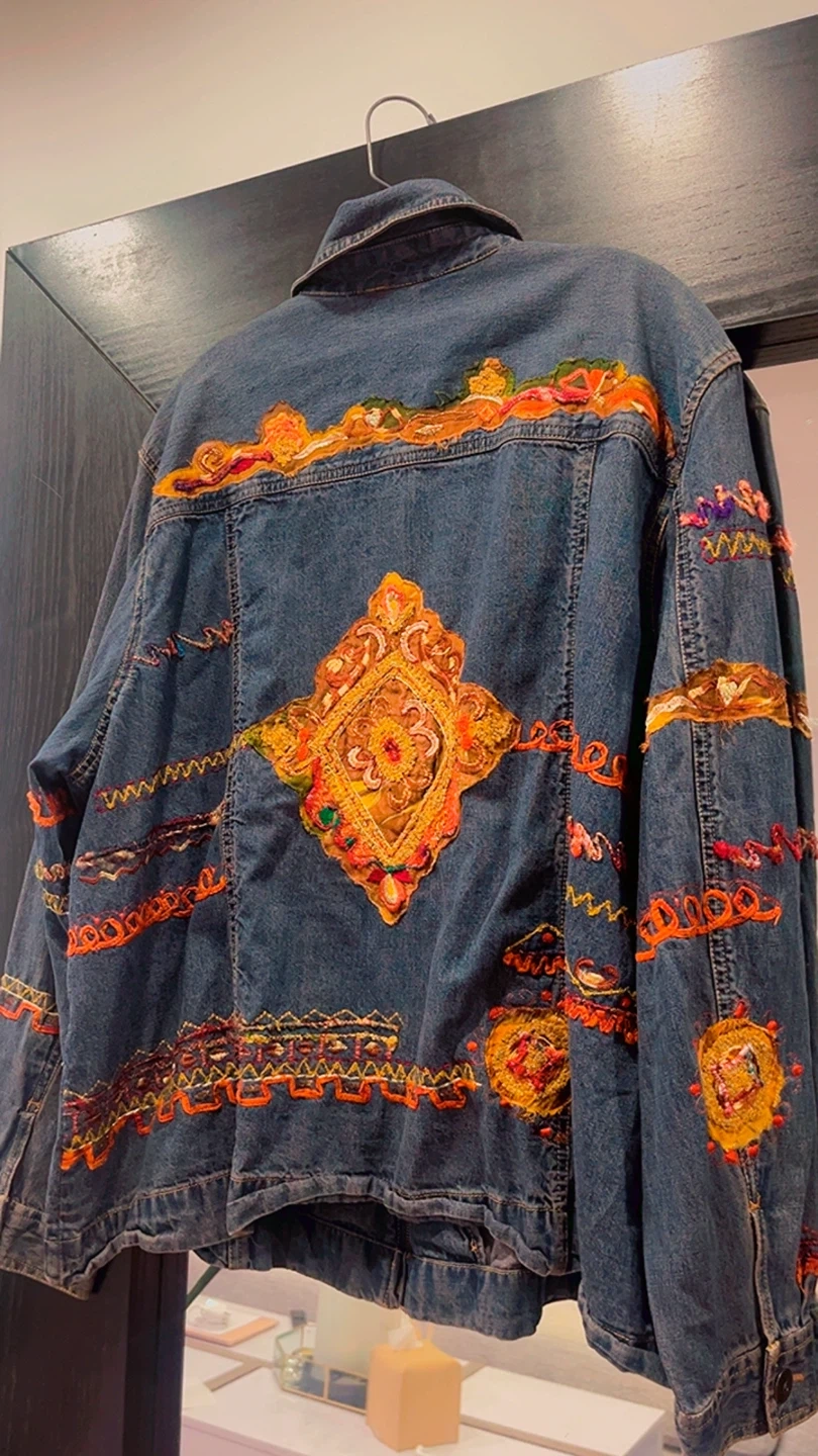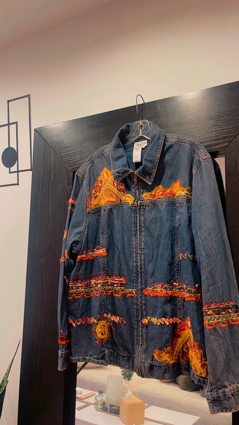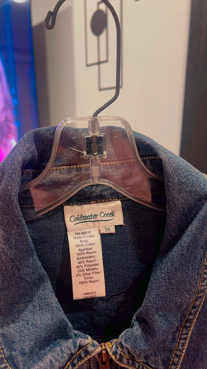 This is a Coldwater Creek denim jacket in size 3X. It features unique embroidery with rayon and cotton. The body is 100% cotton, and the trim is also 100% rayon. Fits like an XL very trendy and vintage like.