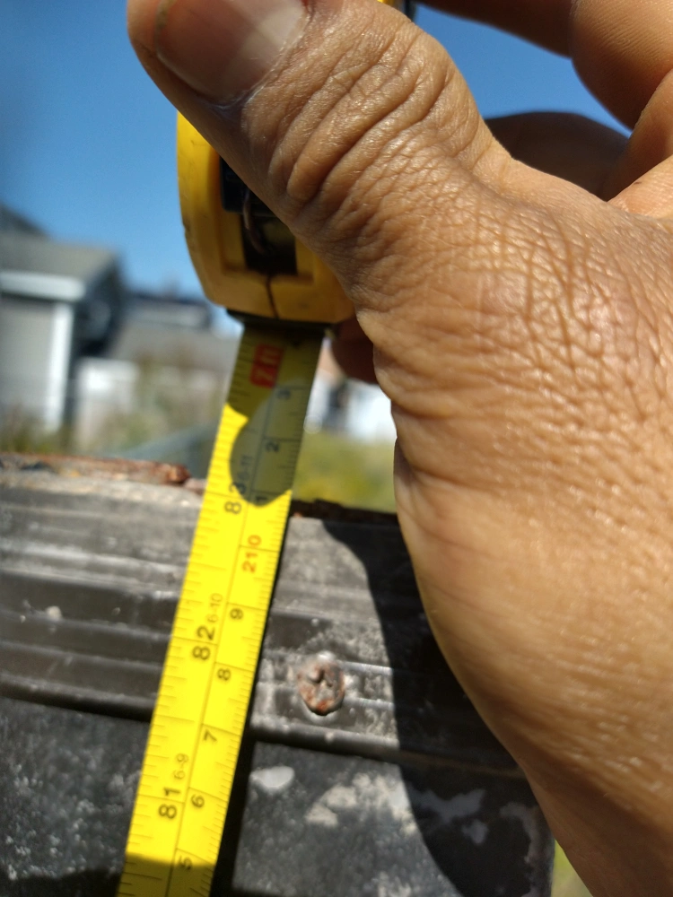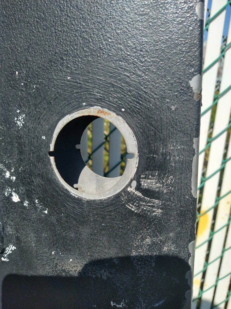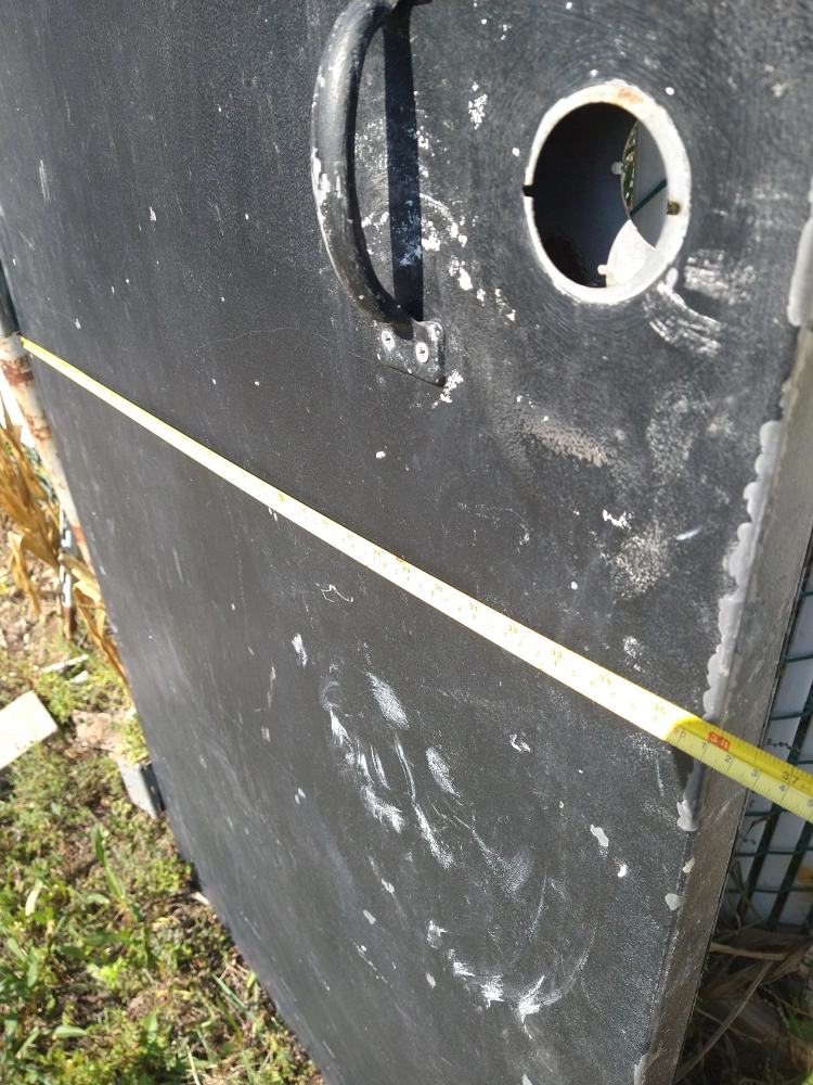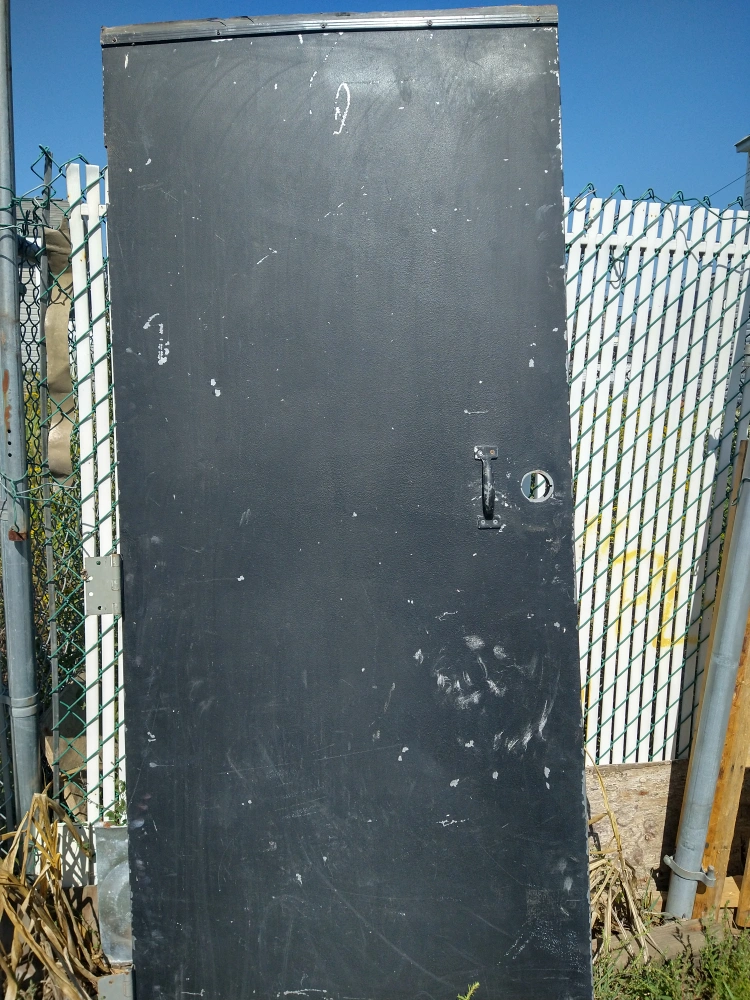10Selling a black metal door. It measures approximately 82 inches tall and 36 inches wide. It has a handle and a hole for a lock. There are some signs of wear and tear.