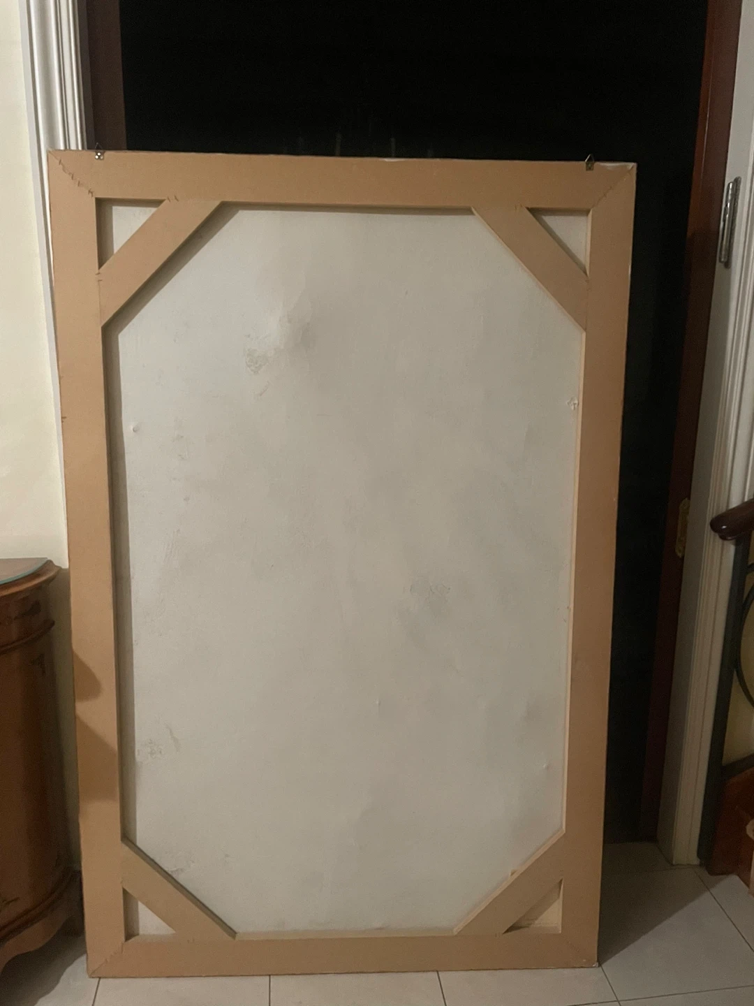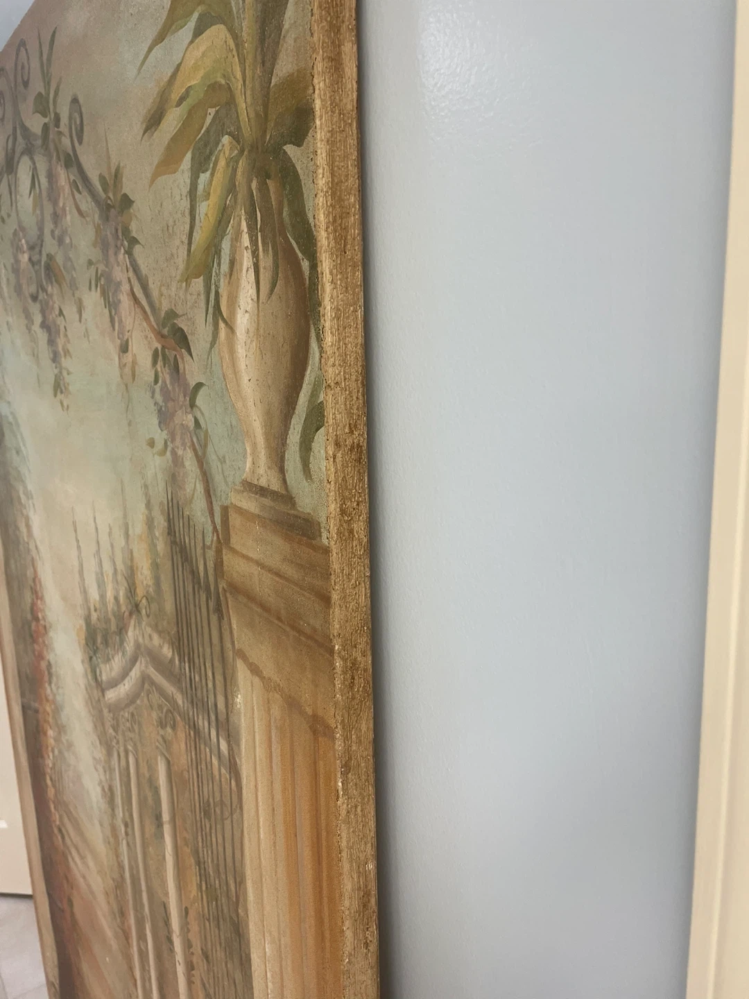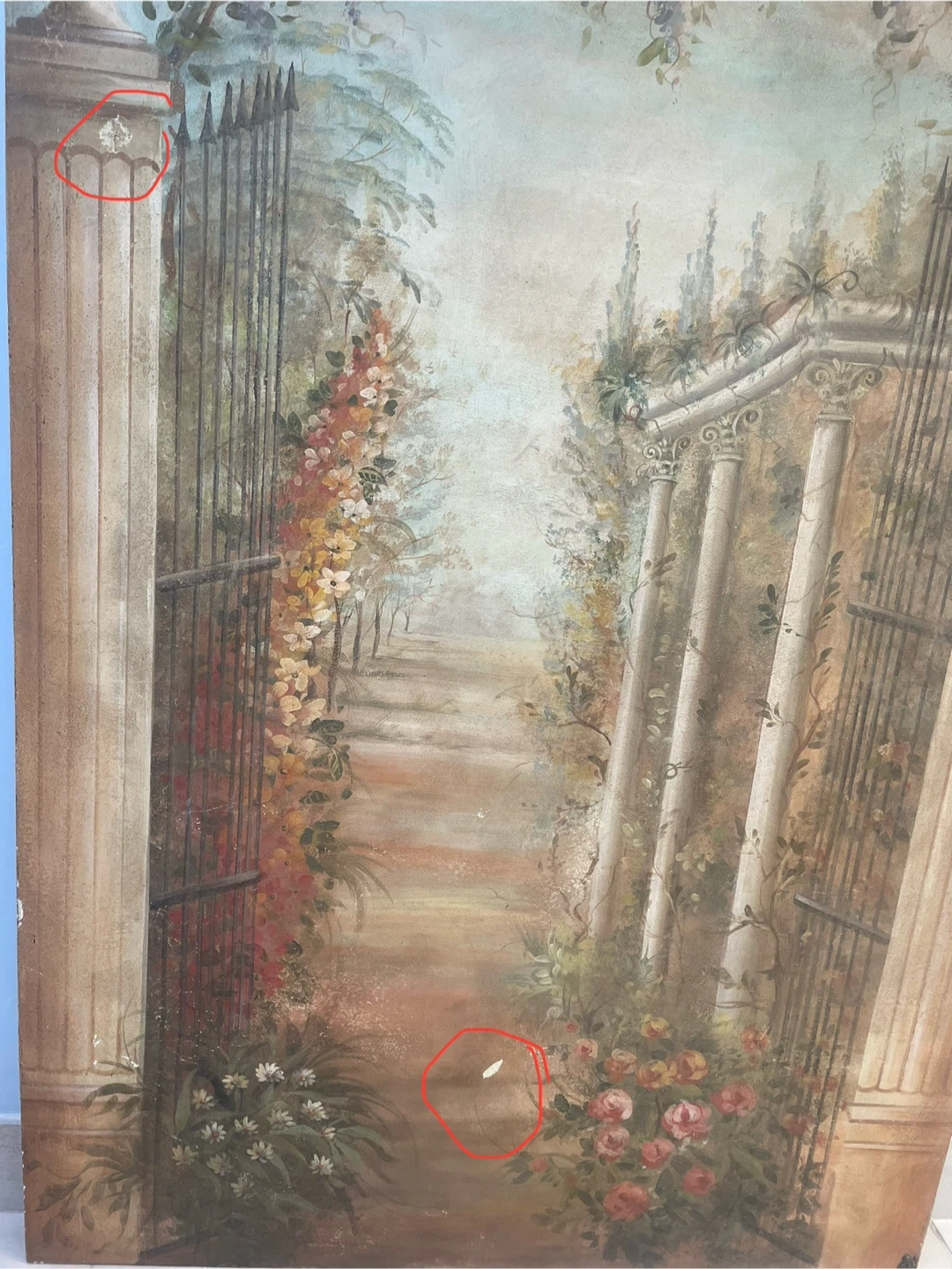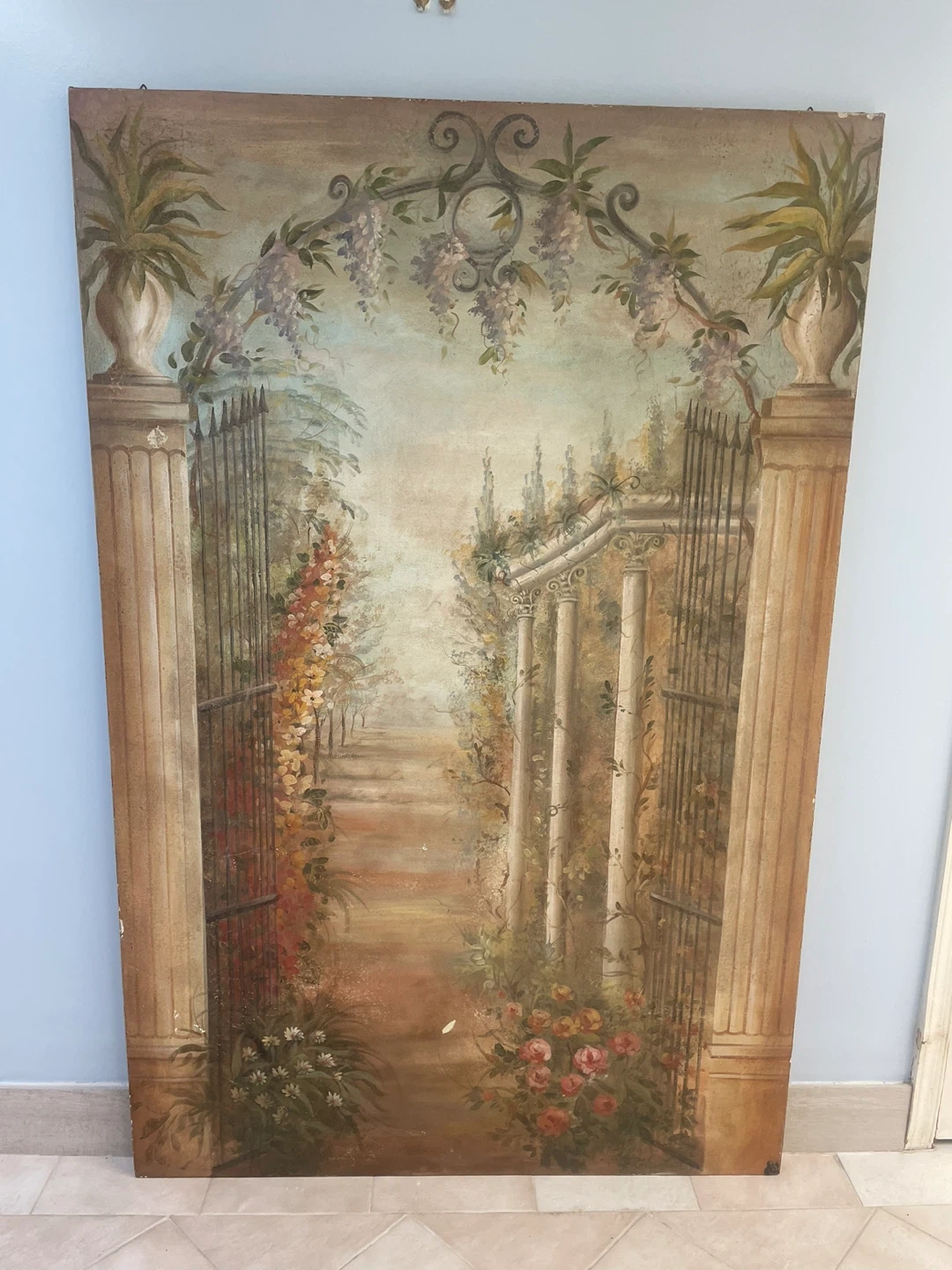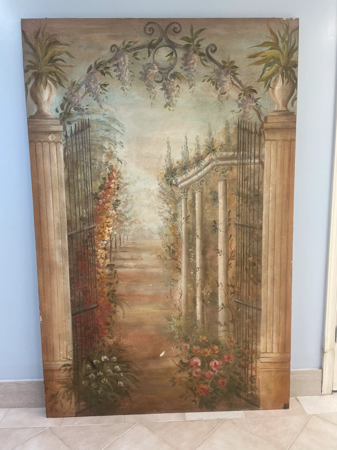 60A vintage Italian hand painted mural panel featuring a romantic garden scene. Huge size. In good condition except for a few spots that need touch up as circled.