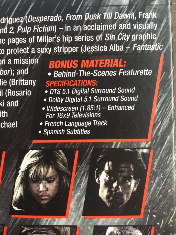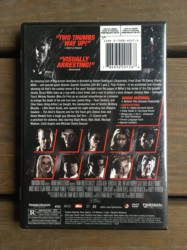 Starring Bruce Willis, Jessica Alba, Benicio Del Toro, Clive Owen, Brittany Murphy and Mickey Rourke. Dolby 5.1 Digital Surround Sound. Behind-the-scenes featurette. From a smoke and pet free home. Check out in person before purchasing. Thanks for looking.