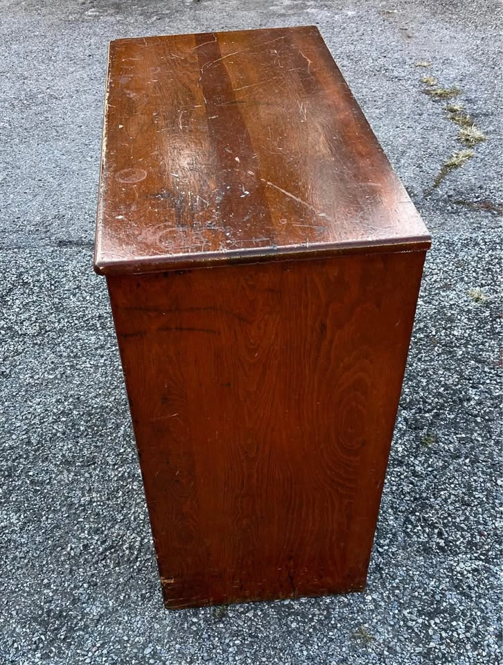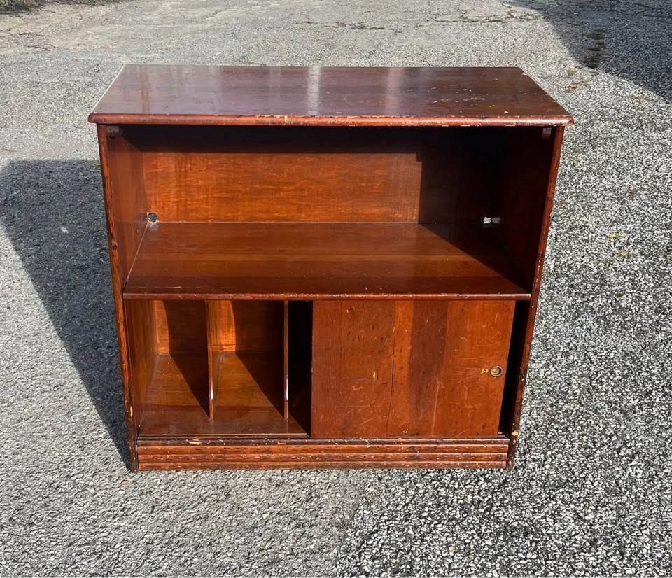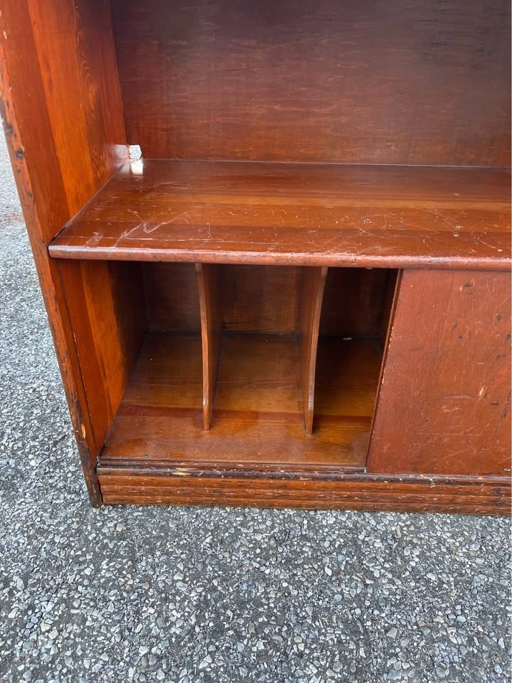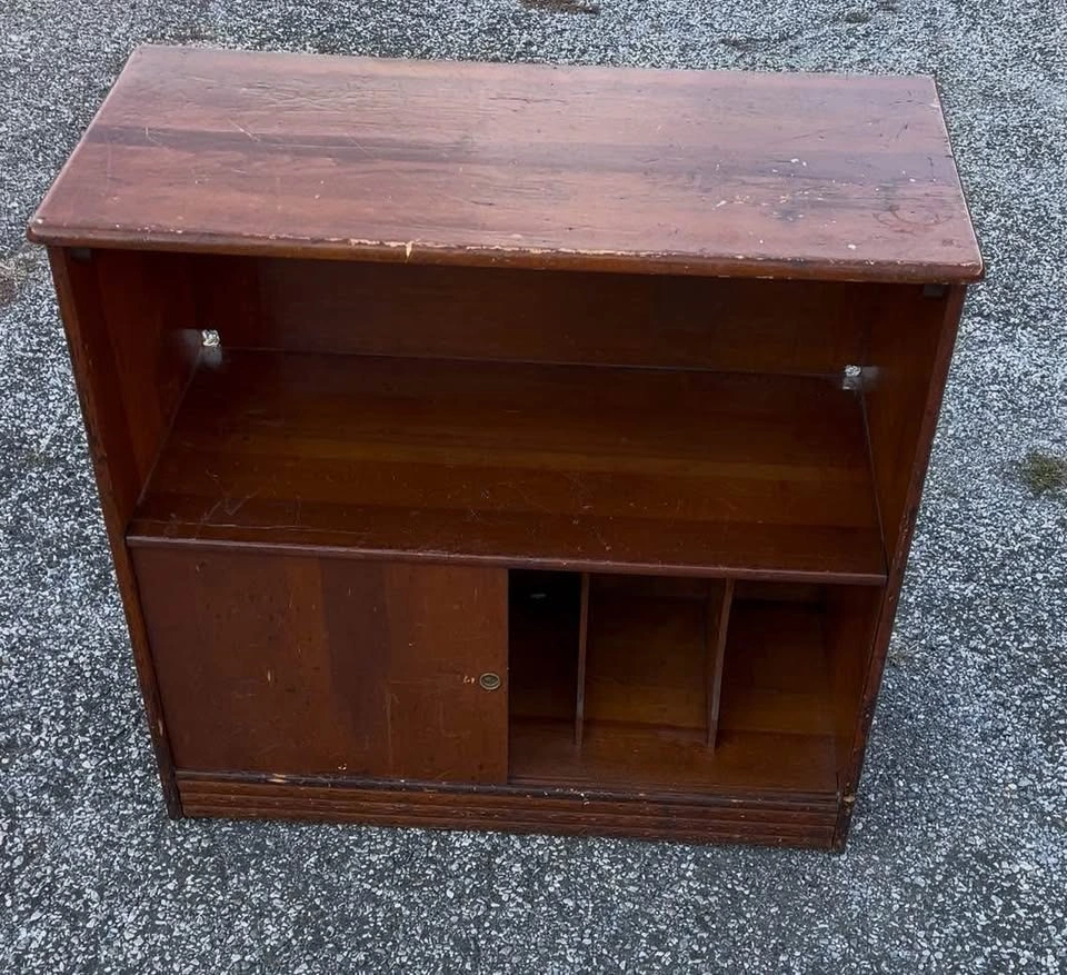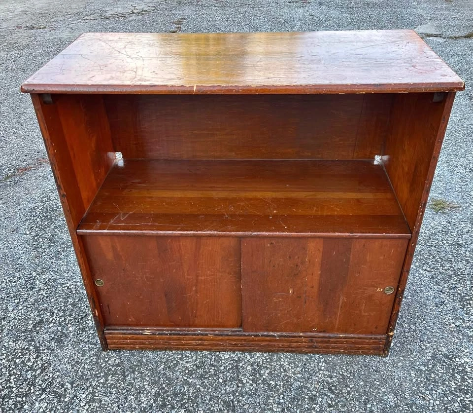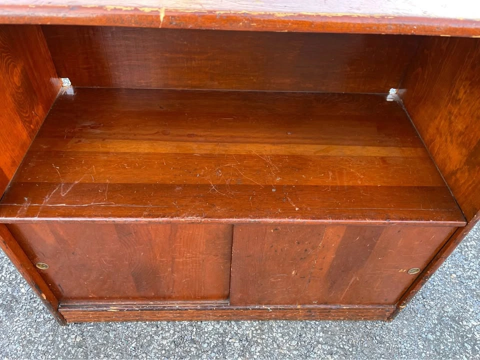 10This wooden credenza/cabinet/ media console or TV stand has many different uses. It has a popular MCM design with open shelving and sliding doors. The sliding doors and compartmentalized shelving are perfect for storing books, records, or other household items. This piece has a vintage appeal and functional design that make it a desirable item. There are some blemishes throughout this piece, as well as stains, cracks and water marks. There are also two holes on either side that were used for speaker wires to pass through. With that being said, it’s a sturdy and structurally sound piece of 70’s furniture that can be left as is or refurbished as you see fit. See my photos and videos. Approximately L33xW16xH30 Cash only Pickup in Sheepshead Bay Brooklyn