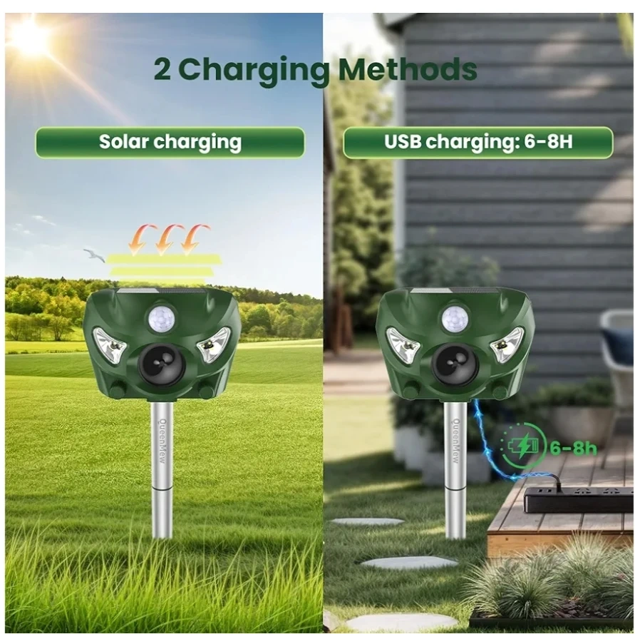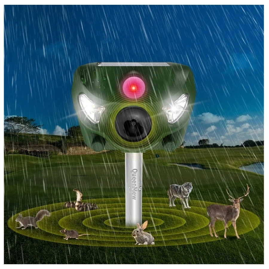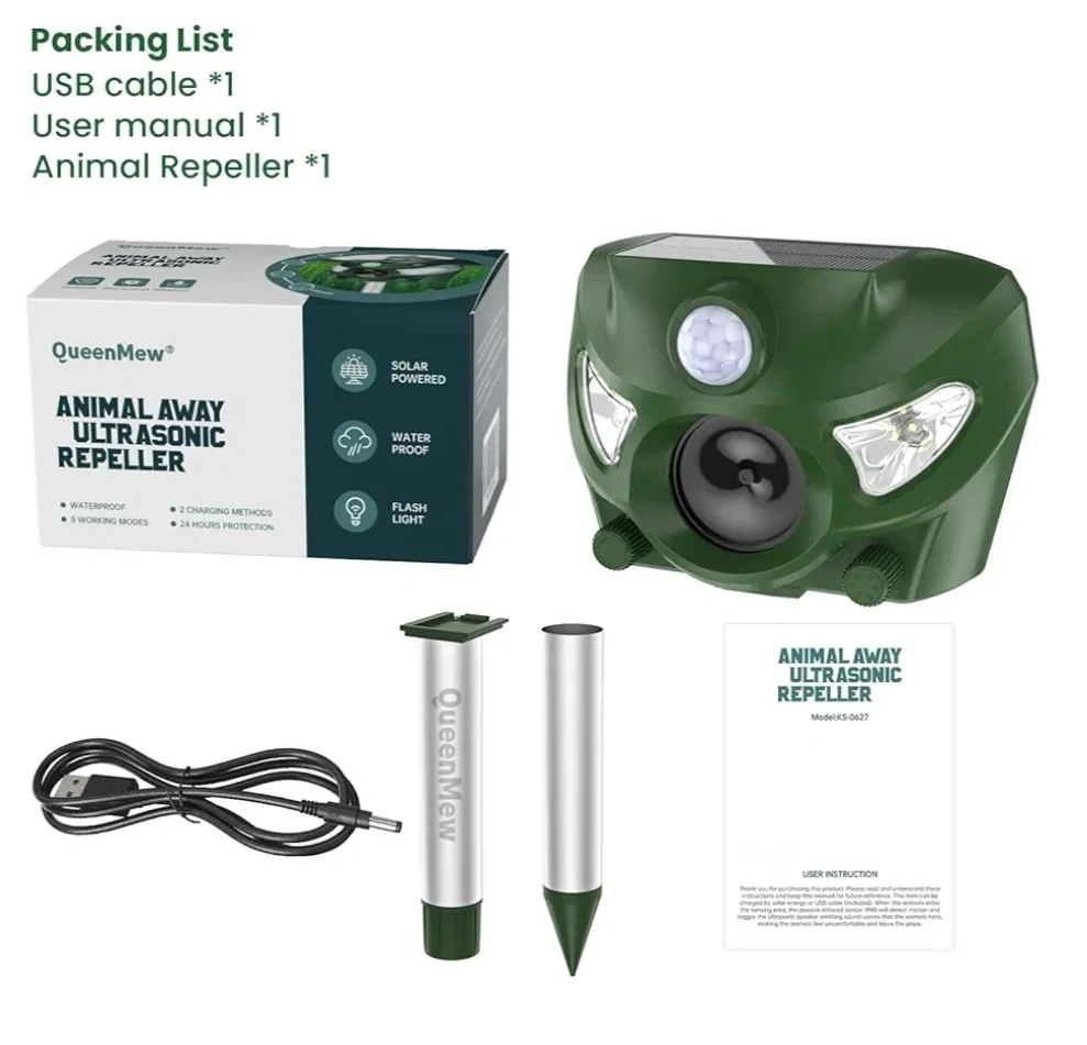 Selling a brand new QueenMew Animal Away Ultrasonic Repeller, model KS-0627! This repeller is designed to keep animals away from your garden, farm, yard, or orchard using ultrasound and flashing lights. It's solar powered and waterproof, so it's perfect for outdoor use. It also has USB charging capabilities. The box includes the USB cable, user manual, and the animal repeller itself