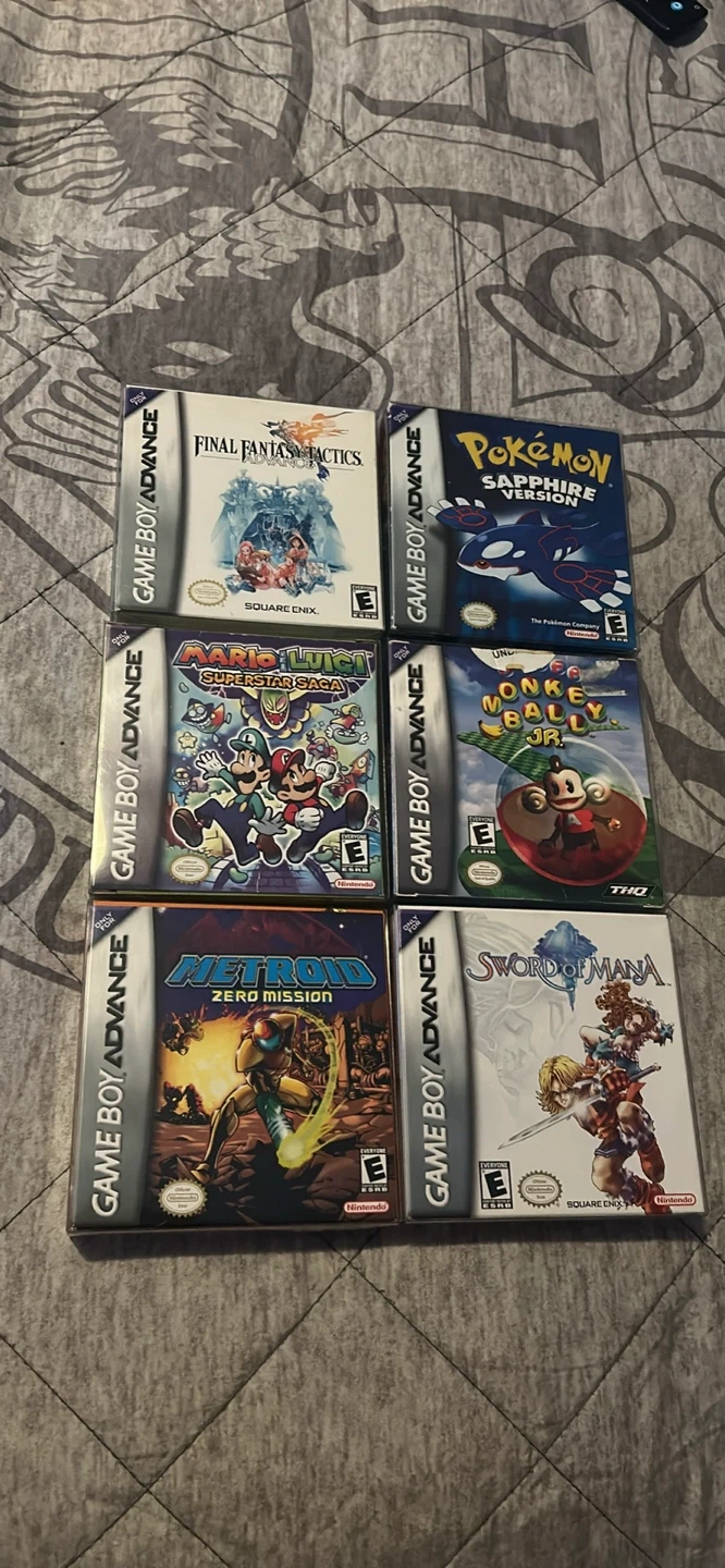 38Selling a collection of Game Boy Advance games. They are all in great condition and ready for a new home! Titles include: - Pokemon Sapphire Version - Mario & Luigi Superstar Saga - Metroid Zero Mission - Sword of Mana - Monkey Ball Jr - Final Fantasy Tactics Advance