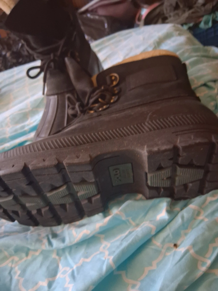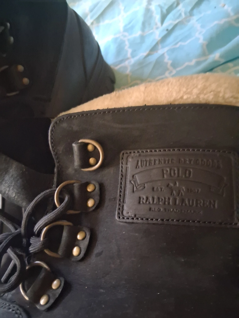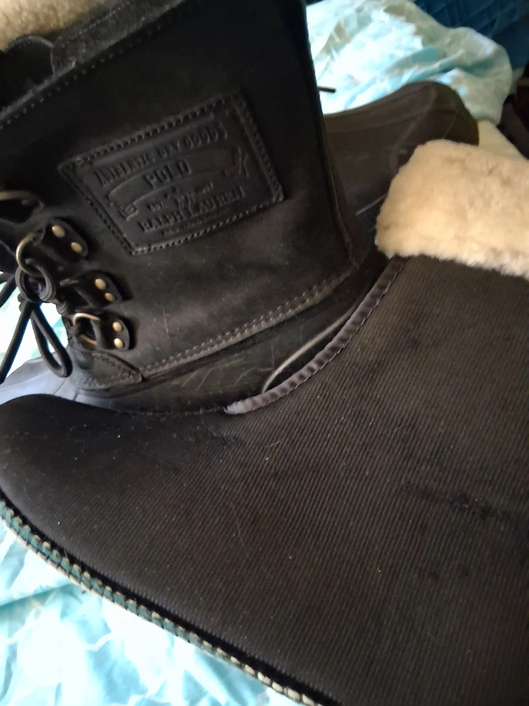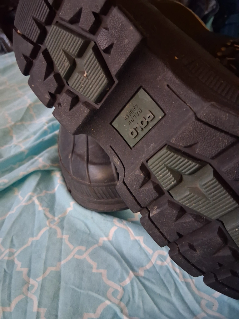 10Polo Ralph Lauren duck boots in good condition. These boots are black with a rubber sole and have a lace-up closure. They feature the Polo Ralph Lauren logo on the side.