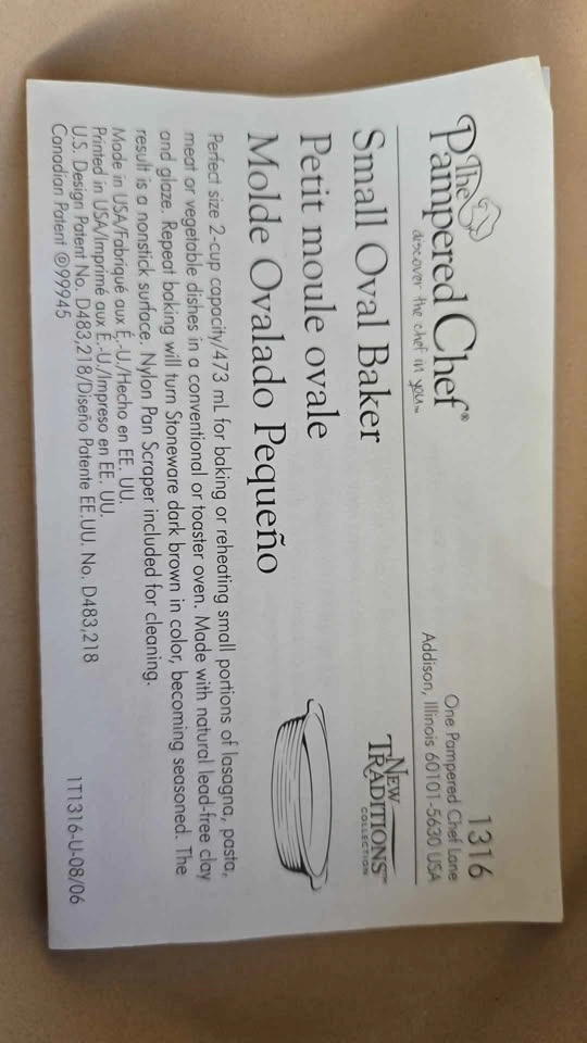 Buy & SellNIB Pampered Chef Small Oval Baker 2 cup capacityNIB Pampered Chef Small Oval Baker 2 cup capacity$15$15 OBO Cash Only. No holds. Meet at Walgreens 1301 E Algonquin Rd Algonquin IL at intersection of Algonquin and Sandbloom Rd just East of Fox RiverConditionNew0 chats·0 favorites·7 viewsSELLERverifiedMarickaAlgonquin600 reviewsWHERE TO MEETWalgreens