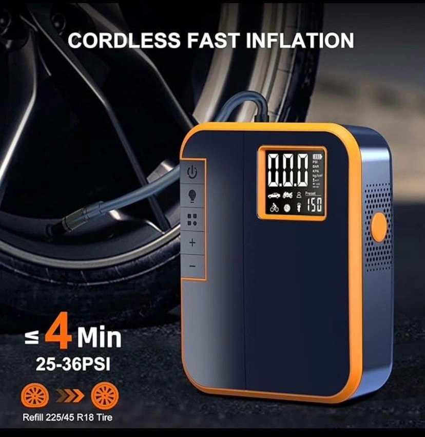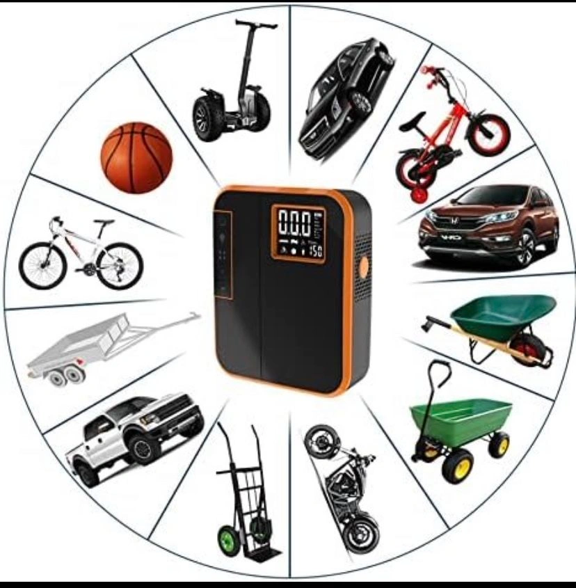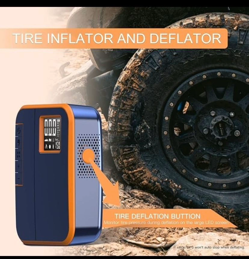 As is, NEW! Portable Air Compressor DP3 Fast Inflation: Inflate an SUV tire from 29PSI to 36PSI in just 90 seconds—ideal for off-road adventures. Long-lasting Power: Inflate up to 4 car tires on a single charge. Can also be powered via a 12V car cigarette lighter. Intelligent Control: Features 5 modes (car, motorcycle, bike, sports ball, customizable) with automatic shut-off at the preset pressure. Deflation Capabilities: Includes an air release button for deflating tires and a large screen for real-time pressure monitoring. Note: No auto-stop during deflation. Versatile Use: Suitable for cars, motorcycles, bicycles, sports balls, and track bike tires with included adapters. Package Includes: Air compressor, flexible hose, valve adapters, swimming ring nozzle, ball needle, 12V car cable, storage case, USB charging cable, and user manual.