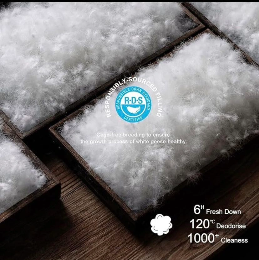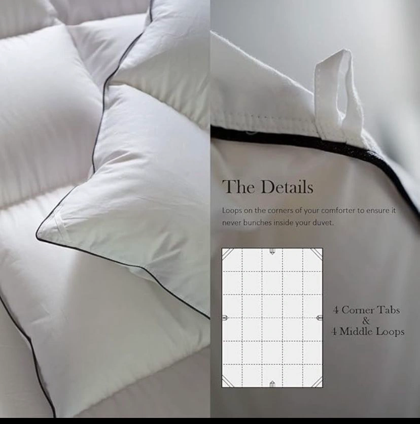 As is, New! All Season weight for Year-round --- Not too hot, not too cold, offer a just-right feel that suits the average sleeper, ideal comfort that perfect for year round, in fall & spring for temps around 65-69 degrees. 80% Goose Feathers & 20% Goose Down --- Selected WHITE GOOSE DOWN & FEATHERS from excellent location and cage-free breeding to ensure the growth process of white geese healthy. More importantly, we added 20% large filling than others! As a result, each down comforter is so fluffy, soft, cozy, and extremely warm, feel like sleeping on a cloud. 100% Cotton Shell --- Comforter cover is made of 100% Cotton which is ultra-soft and breathable. Finished with a black decorative piped edge, adds a luxurious layer to your bed. Hooks on the corners for you to attach to a duvet cover to keep the down comforter from slipping and sliding. The special design of box construction keeps the filling in place and ensure a stable sleep. Size: Twin Color: White