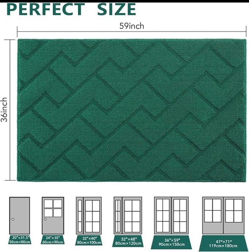 Brand New! Our Indoor Doormat features high-quality absorbent polypropylene fabric and a double-layer design that quickly captures moisture and dirt, keeping your floors clean and dry. The non-skid TPR rubber backing ensures it won't scuff your floors, making it ideal for both indoor and outdoor use. Measuring 36" x 59" x 0.4", this low-profile doormat won't hinder door movement. Available in a variety of stylish colors and patterns, it adds a charming touch to your home décor. The unique ribbed fabric design effectively removes dirt from shoes. To clean, simply shake off debris outdoors, sweep or vacuum regularly, or rinse with a garden hose. For deeper cleaning, it's machine washable at water temperatures below 86°F (30°C). Avoid ironing, bleaching, or prolonged sun exposure. Perfect for any weather, our doormat serves as a front door mat, outdoor mat, welcome mat, entryway mat, shoe mat, dog doormat, and more. It effectively scrapes away dirt, water, dust, sand, mud, and snow. Color: Green Dimensions: 3 x 5 ft