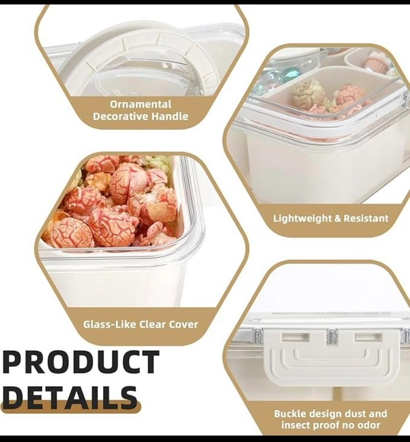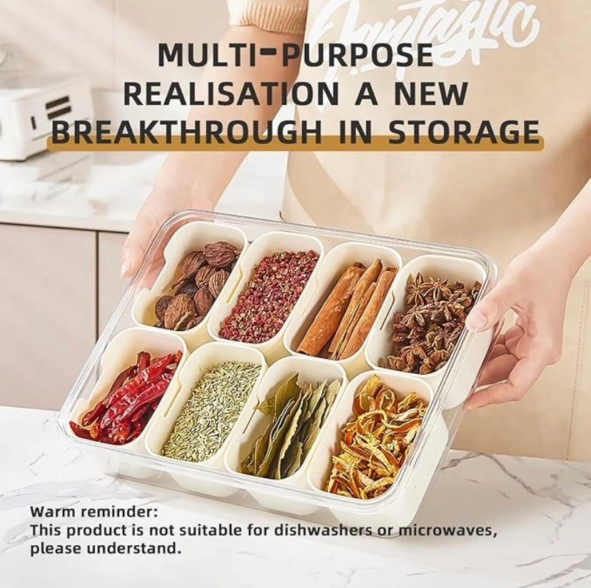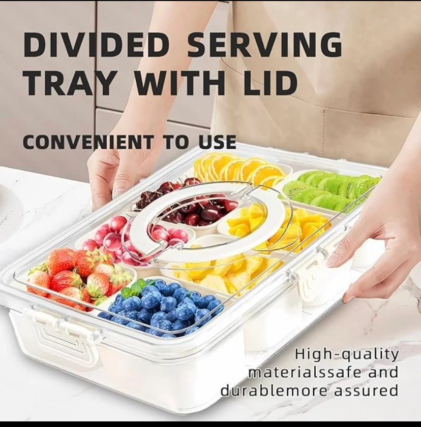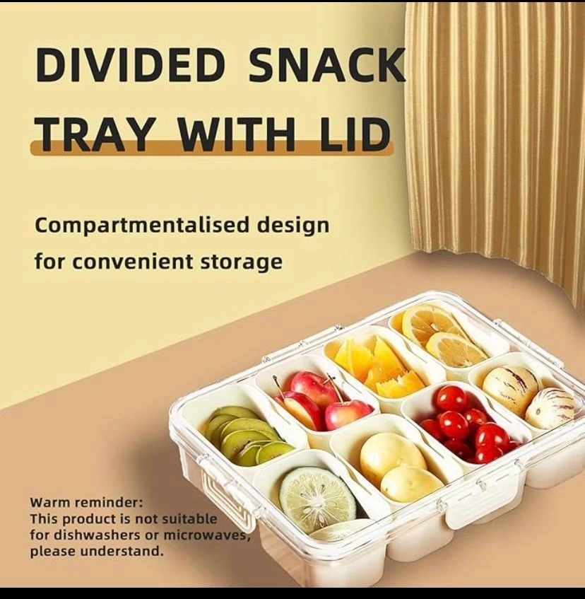 NEW!! Snack Box Container with Lid. This transparent container keeps snacks fresh and organized, featuring an 8-divider design with a lid and handle for easy use. Ideal for picnics, living rooms, refrigerators, and kitchens. Note: Not dishwasher safe.