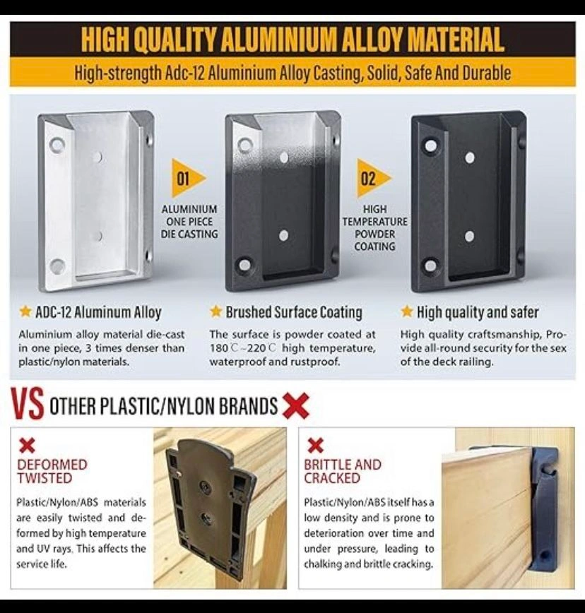High-Quality Construction: Made from high-strength ADC-12 Aluminum alloy, these deck railing connectors are three times denser than Plastic/Nylon, offering robust durability. Resistant to deformation and breakage, they excel in corrosion resistance, UV protection, high temperatures, and longevity.