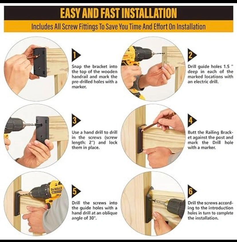 Easy Installation: Snap brackets onto the horizontal handrail, drill pilot holes, and secure with included screws. Additional sanding or trimming of wood posts may be needed for precise fitting. Includes all necessary screws and a 1/8" wooden drill bit for immediate setup.