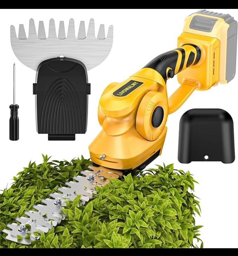 As is, new unopened box. Triple Design Upgrade: Metal gears enhance durability and reduce maintenance. Ultra-powerful motor reduces wear, noise < 55dB, operates up to 18,000 RPM. Manganese 65 blades are corrosion-resistant, durable, impact-resistant. 2 in 1 High Performance: Dual blades for hedge trimming and grass shearing. 5.1" width blade for grass, edge cutting; 8.7" blade for pruning. Cordless Battery Powered: Compatible with dewalt 20V lithium-ion batteries. Built-in low-voltage protection for battery safety. Lightweight & Easy to Use: Weighs 1.8lbs, easy one-hand operation. Tool-free blade replacement. Extended Operating Time: Up to 120 minutes (short blade), 80 minutes (long blade) runtime. Dual Safety Guarantee: Safety lock and soft start for enhanced safety. Note: Clean and dry blade after use. Pre-applied lubricant on gears normal. Store safely away from children. Includes 2 blades, batteries not included.